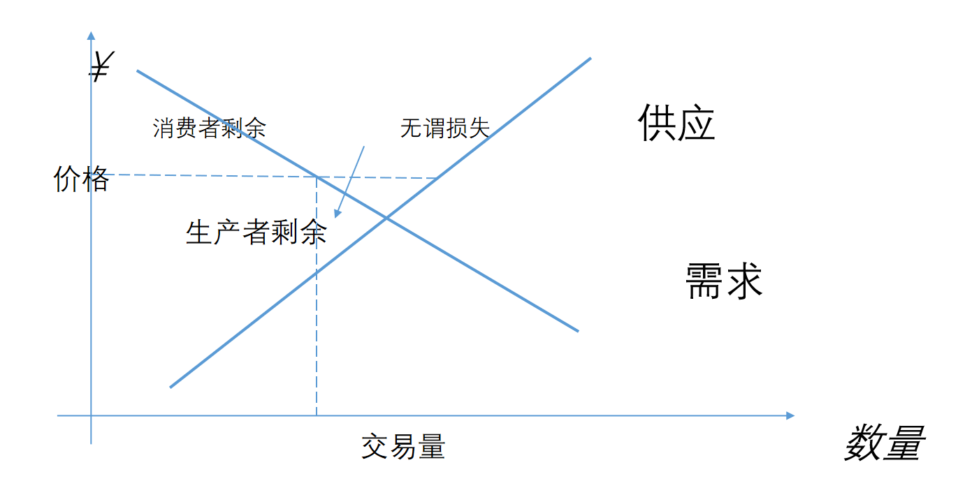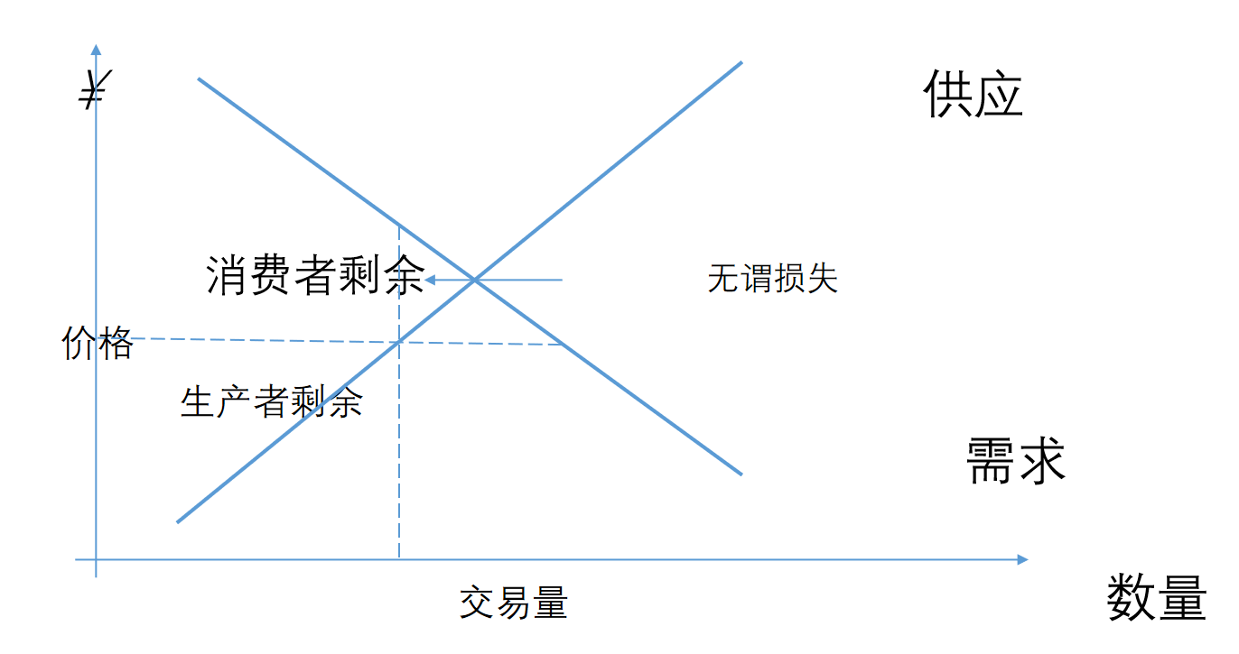 - 在均衡价格水平线的上方需求曲线的下方是消费者剩余,代表了所有在这个市场里买到商品的消费者所获得的总福利。