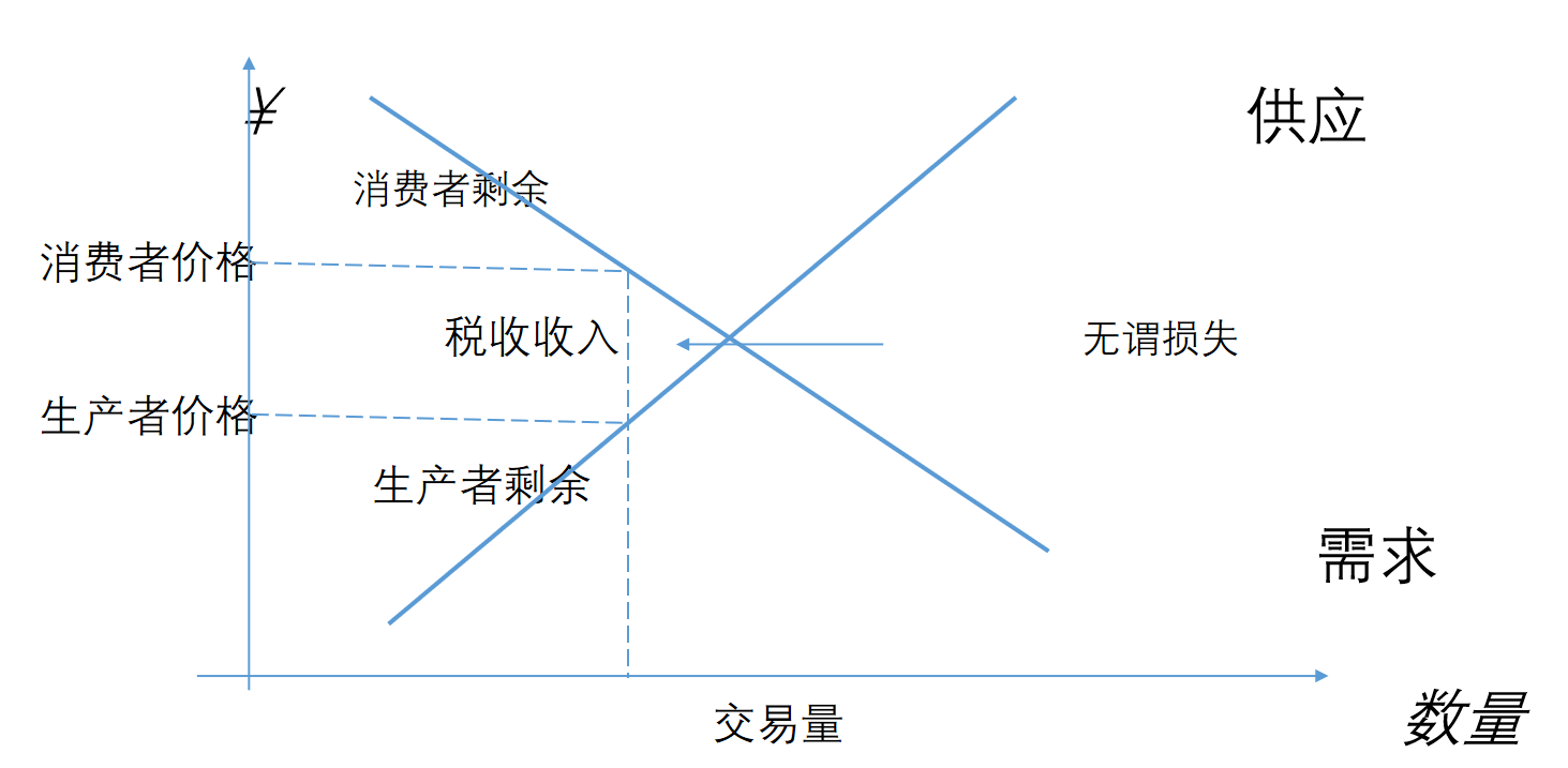 - 税收使得消费者支付的价格变高了,而生产者实际得到的价格变低了,两者之差就是税额。这个政策的直接后果是交易量减少了。