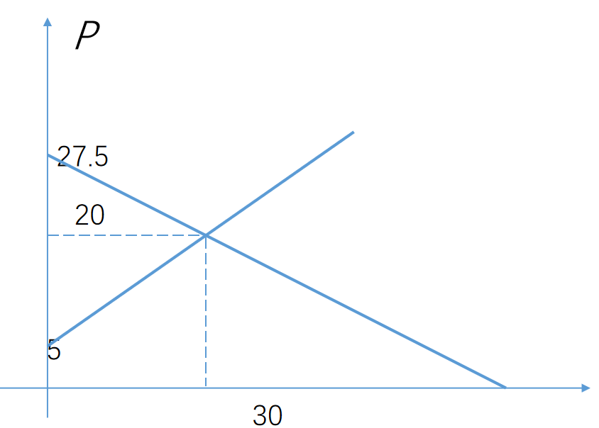 Q = 110 − 4 ∗ 20 = 30 Q = 110 - 4 * 20 = 30 Q=110−4∗20=30所以均衡产量 Q = 30。