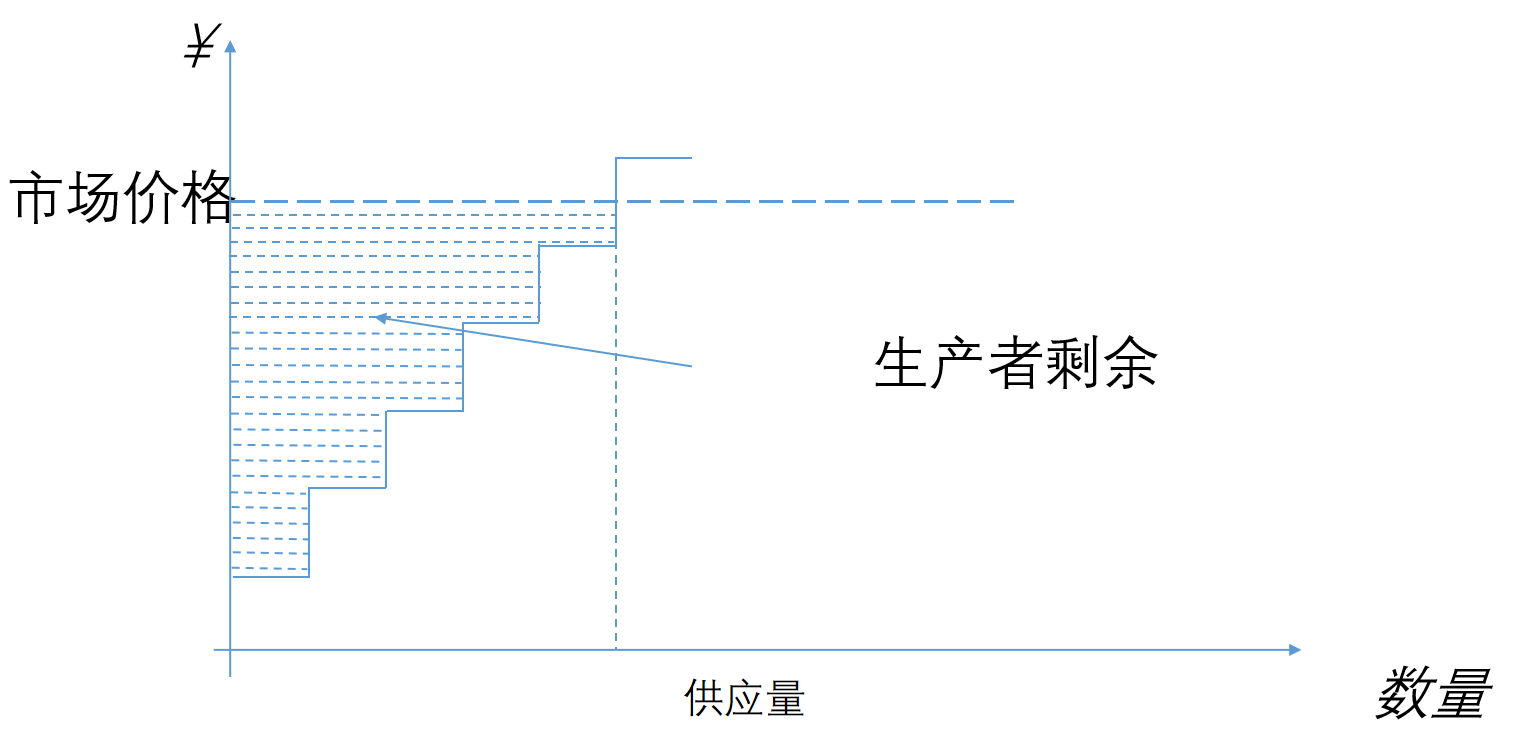 - 在均衡价格水平线的下方供给曲线的上方是生产者剩余,代表了所有在这个市场里卖出商品的生产者所获得的总福利。