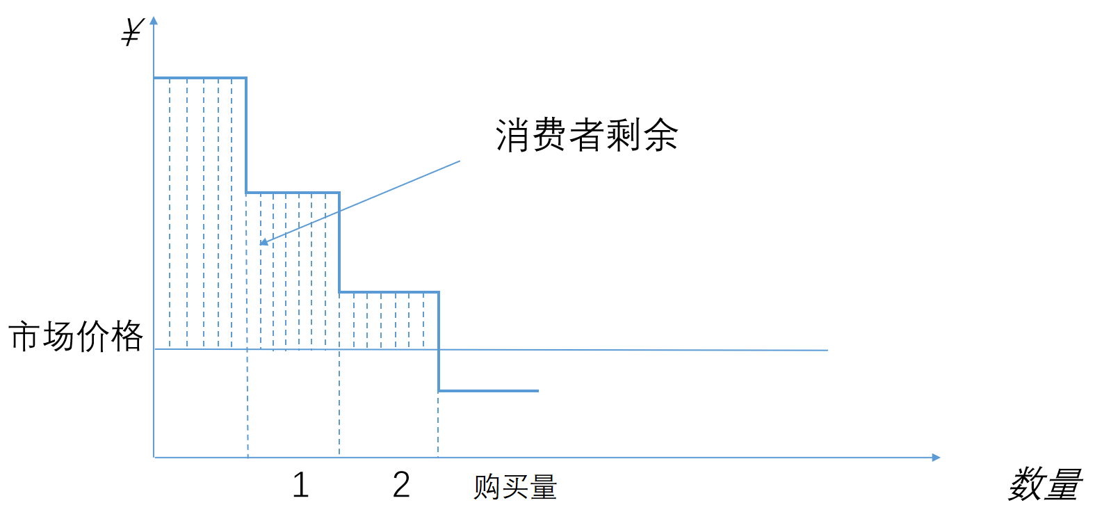 - 消费者从交易中获得剩余的方式:市场对所有购买者都收取一个统一的价格,但每个消费者对每一单位商品的支付意愿是不同的,且通常是递减的。只要消费者的个人评价高于市场价格就能从中获益。