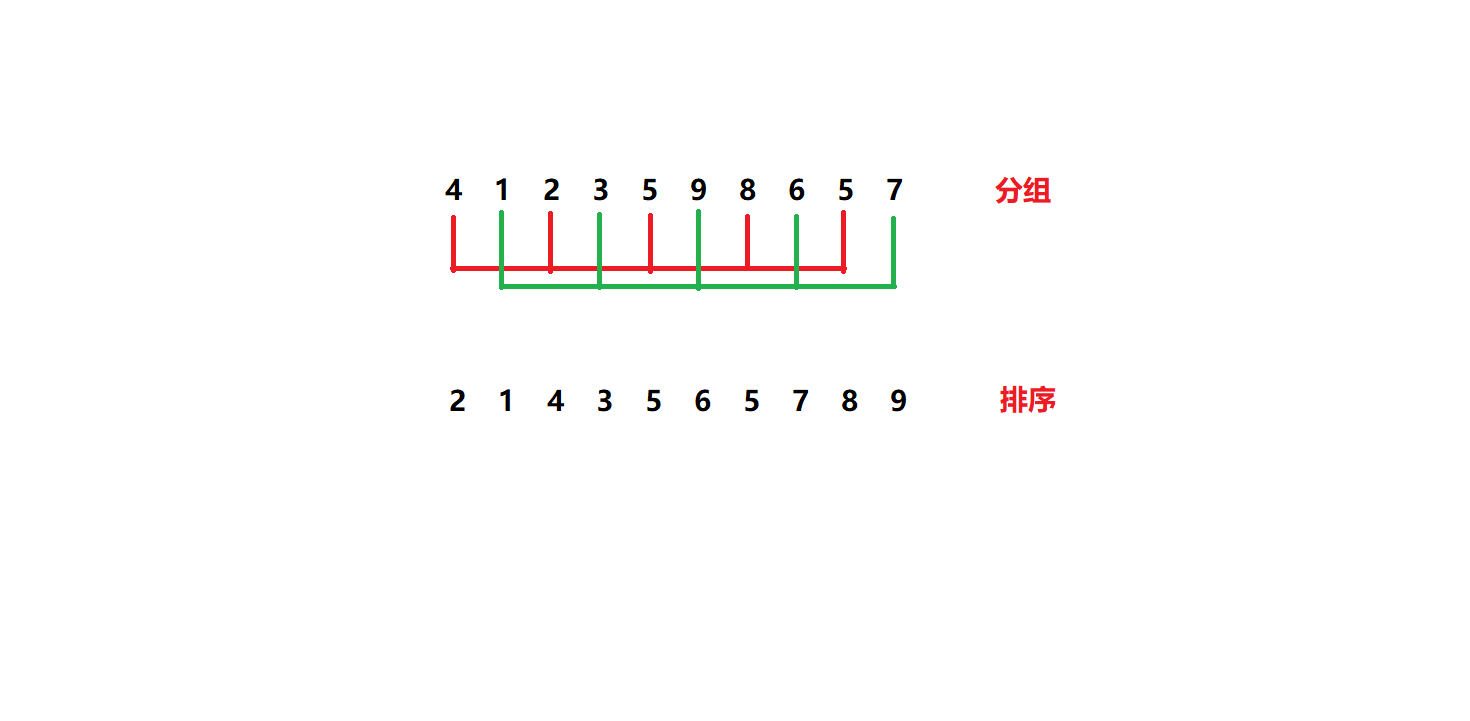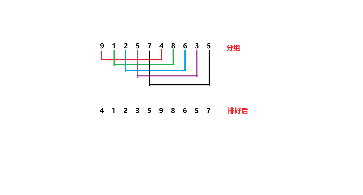 如图是一个乱序序列。元素个数为10。我们一开始先假设 gap = 5 ,那么分组情况、分组直插排序后结果如下图(这里我们每一种颜色的线连的数据为一组):
