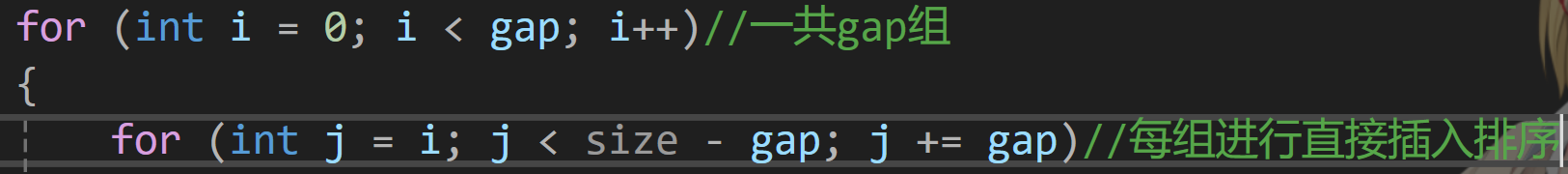 for (int i = 0; i < size - gap; i++)//①//结合图理解i < size - gap;而i++可以做到直插排序每一组数据,也就不需要另外的循环