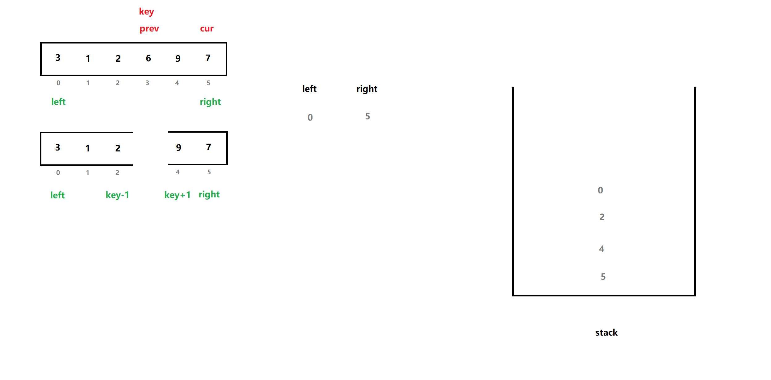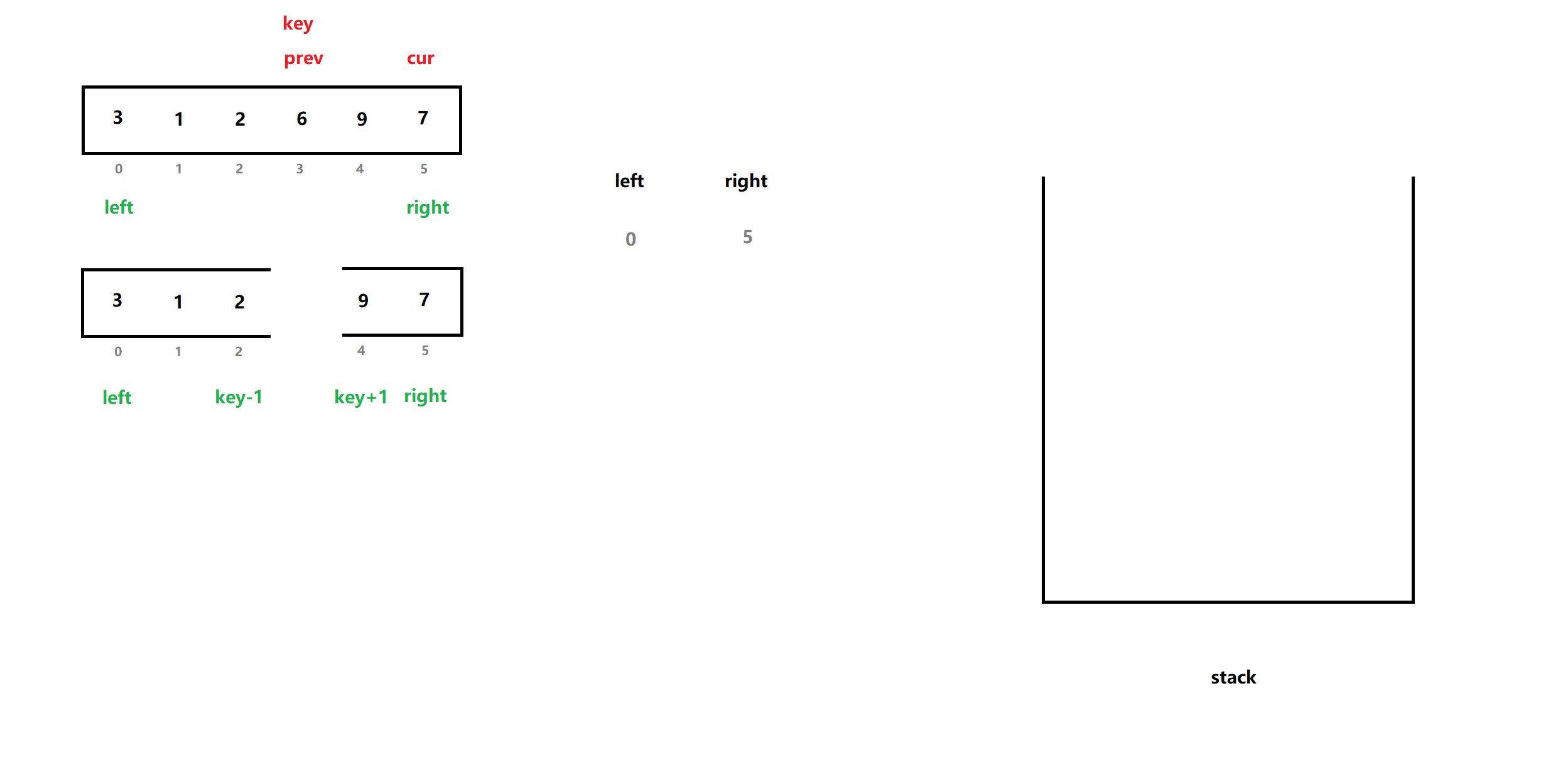 - 搭框架,即确定排完当前范围的序列,继续排基准值左、右两个子序列的方向
