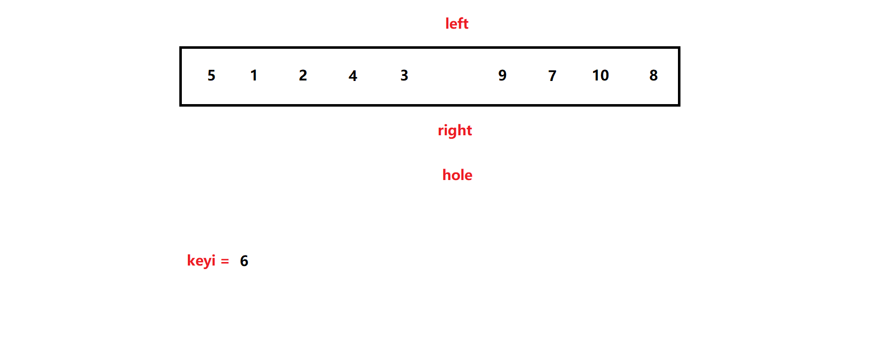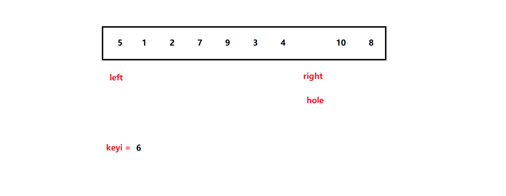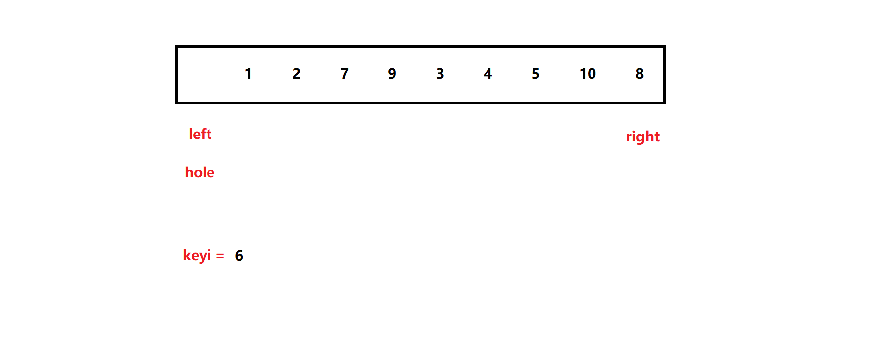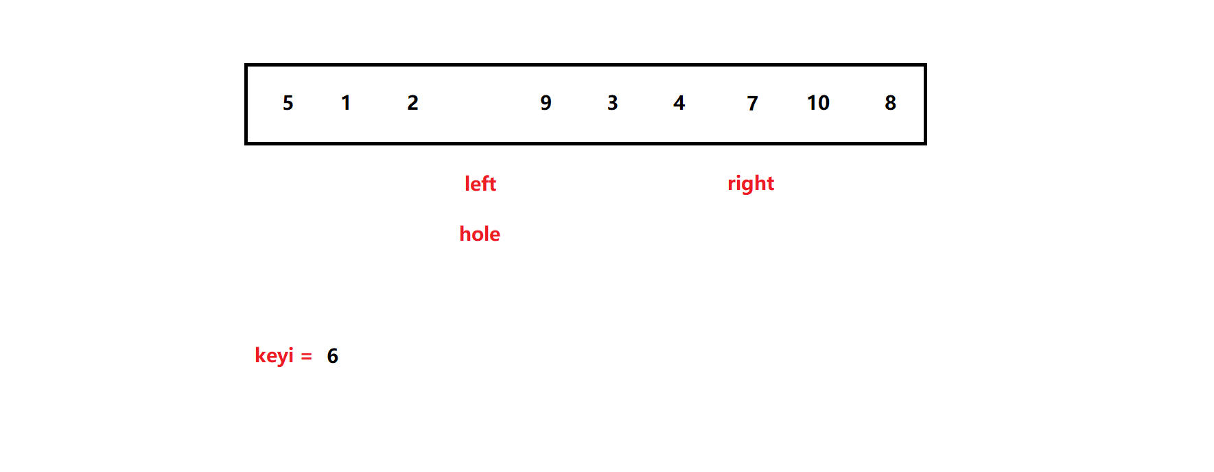 然而,我们再定义一个变量hole 。我们先将hole放在数组的最左侧,即left位置处,然后在hole处挖一个坑 ,将此时的6作为基准值: