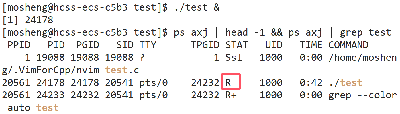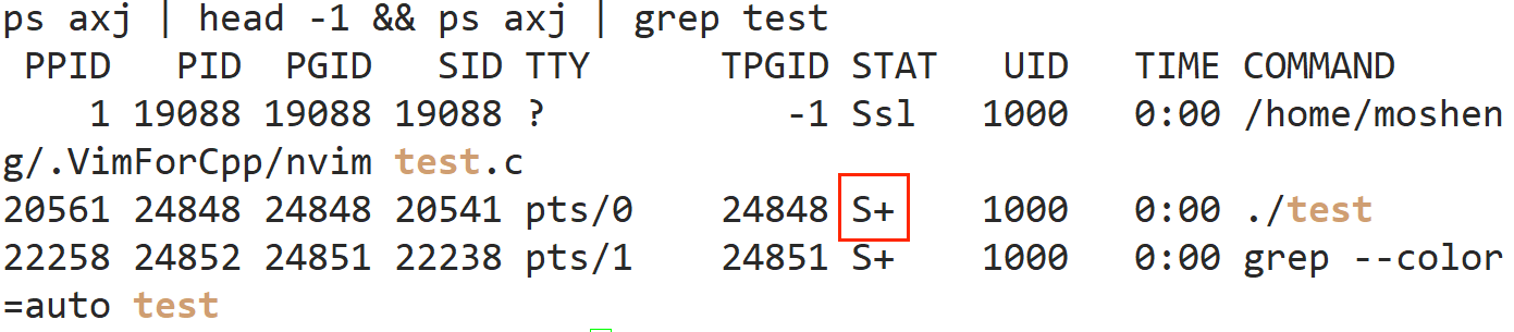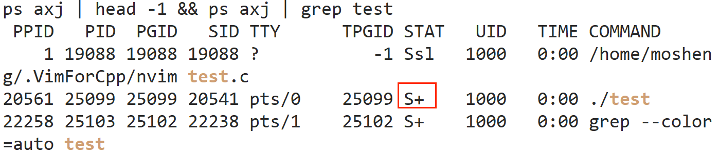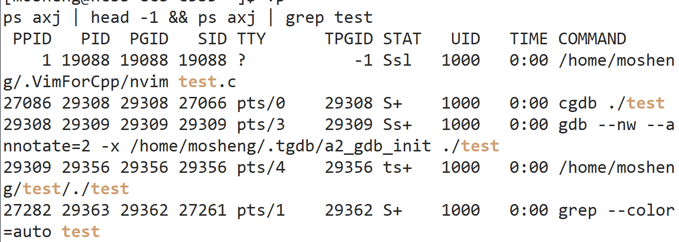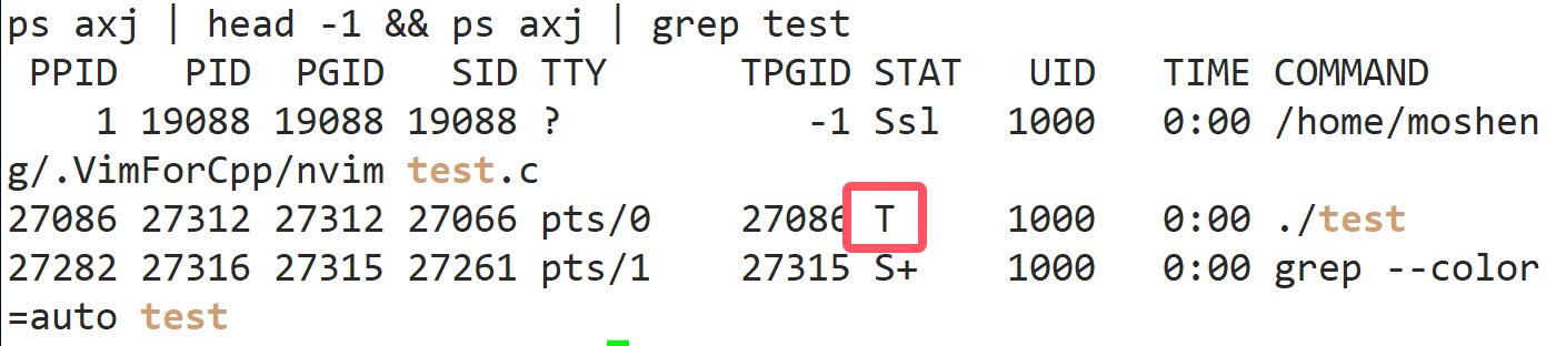 不只是t的原因:ts+:因为我用了 CGDB 调试(终端前台运行),GDB 为 test 进程创建了独立会话,且占用终端前台 → 三个标记同时触发。