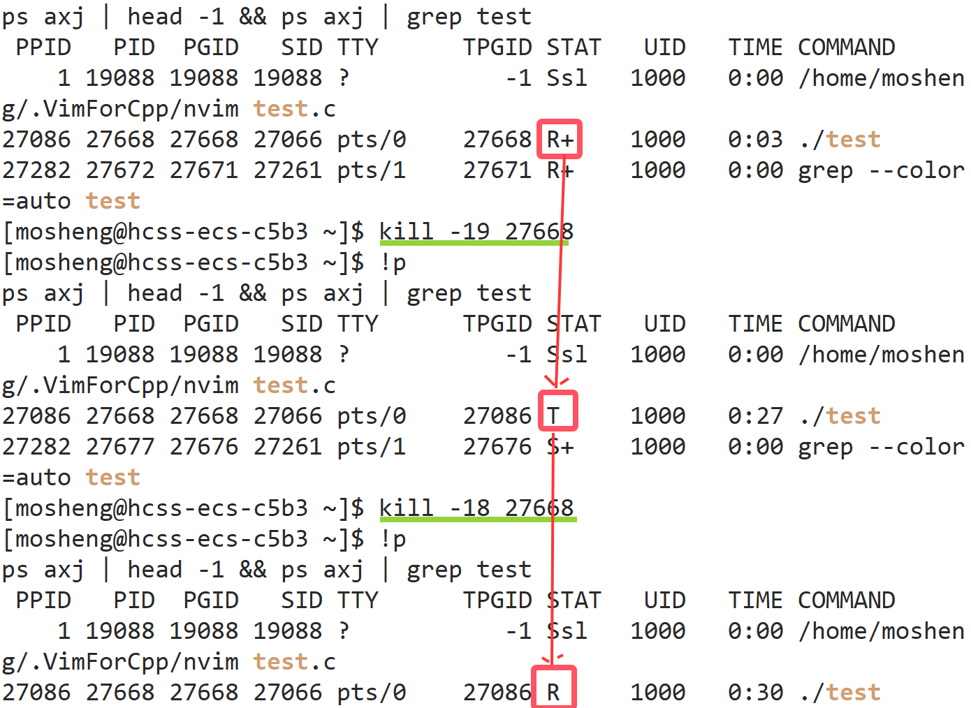 - 放在前台运行,这个时候是R+状态,我们发送暂停信号之后,会变成T状态,而且会把这个进程从前台给它放到后台中去,即便是发送恢复信号也不能从后台移动到前台了。