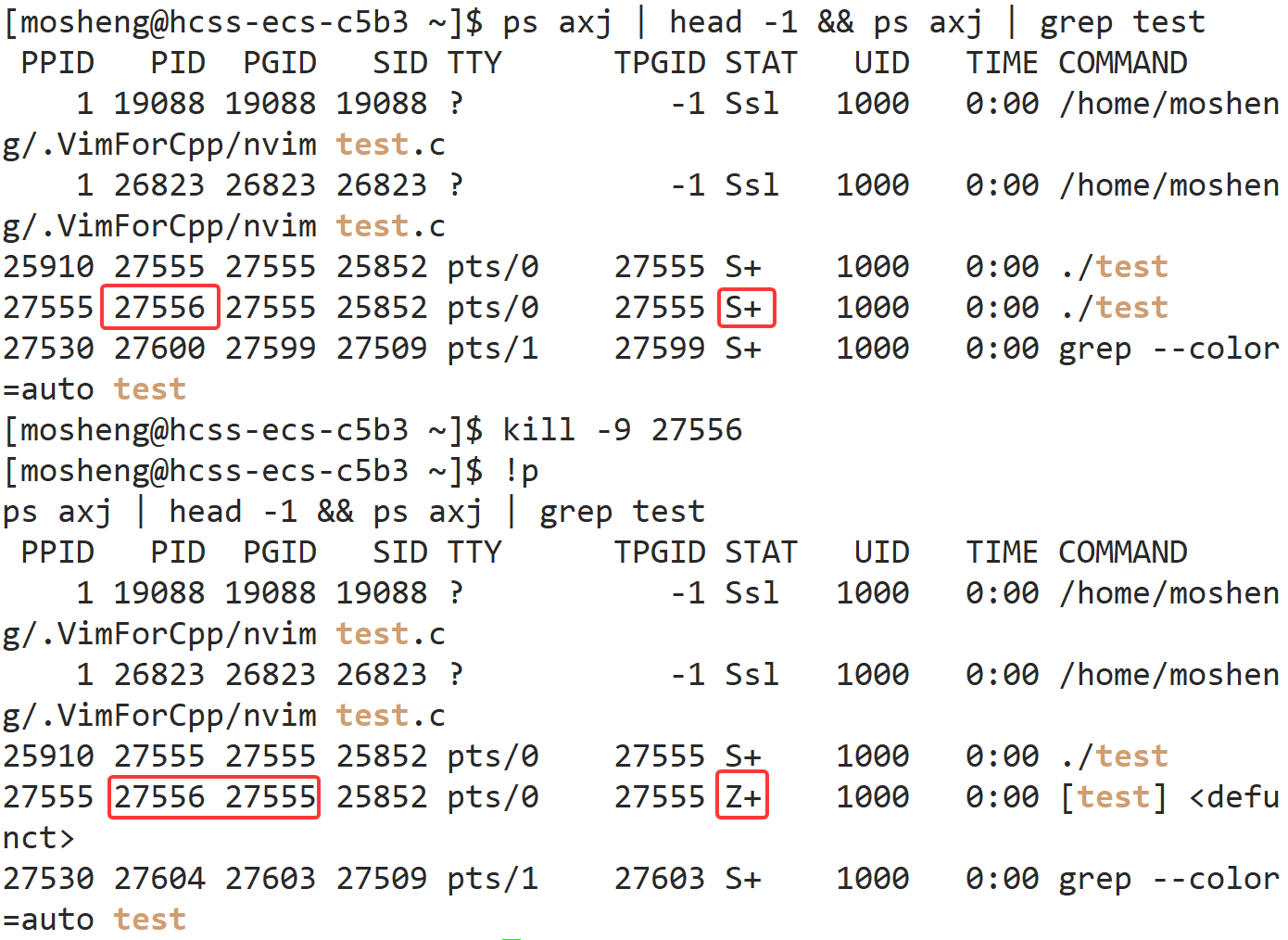 - 可以看到在发送信号给27556之后,这个子进程并没有直接消失,他依旧可以显示在任务列表,是Z状态。