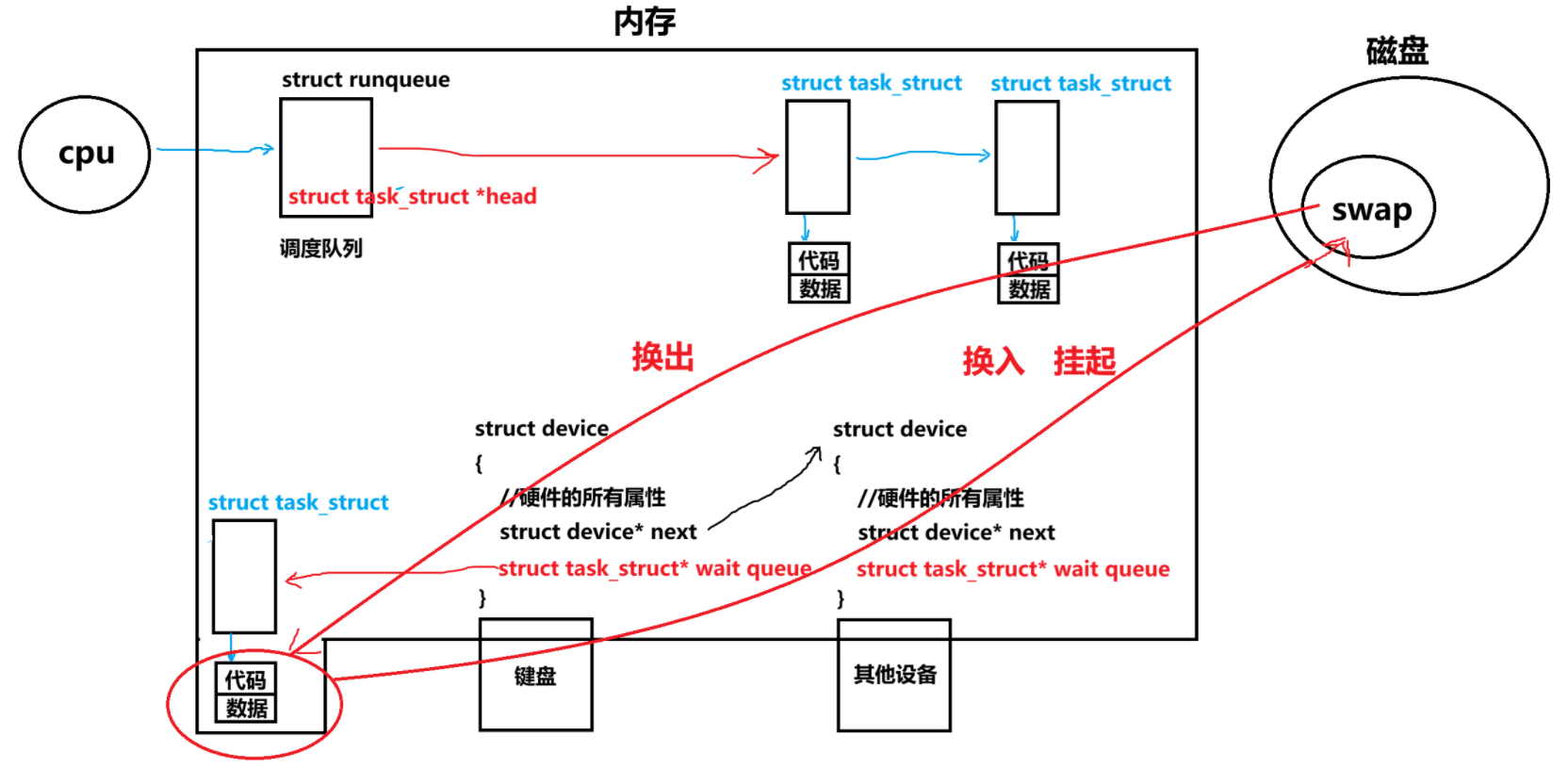 - 要知道,无论是运行还是阻塞状态它们的test_task和代码数据可是一直都在内存里面存着,而内存的空间有限,如果进程太多,内存满了该怎么办?