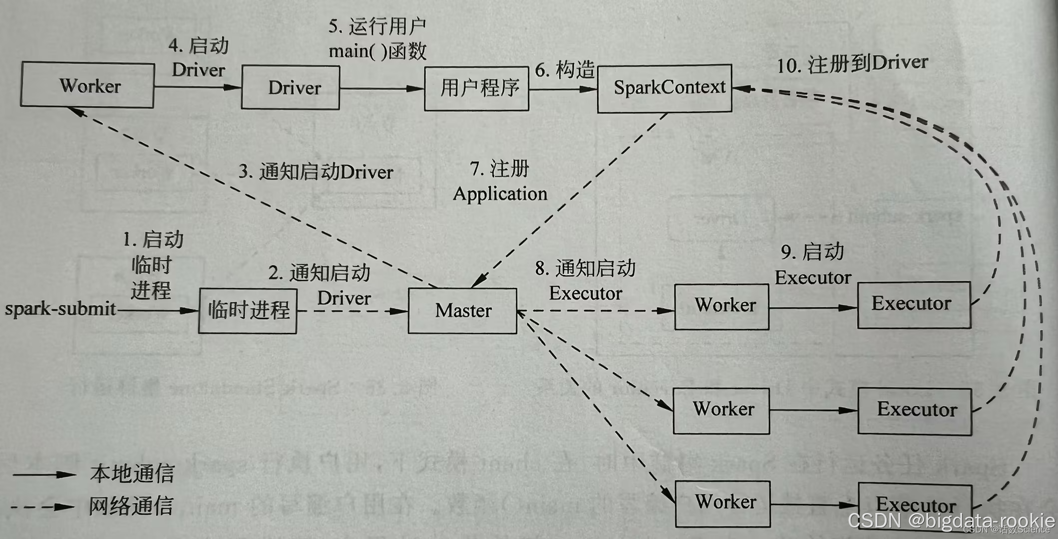 - 临时进程向 ClusterManager(ResourceManager) 通信申请启动 ApplicationMaster(Driver);