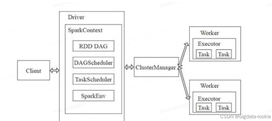 ClusterManager 是 Spark 资源管理系统的核心组件,负责分配和管理集群资源。standalone 模式中即 Master 节点,控制整个集群;yarn 模式中则是 JobManager;