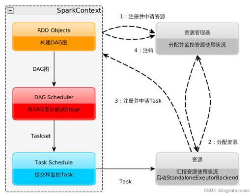 - Executor 向 SparkContext 申请 Task ,Task Secheduler 将 Task发送给 Executor,同时 SparkContext 将程序代码发送给 Executor;