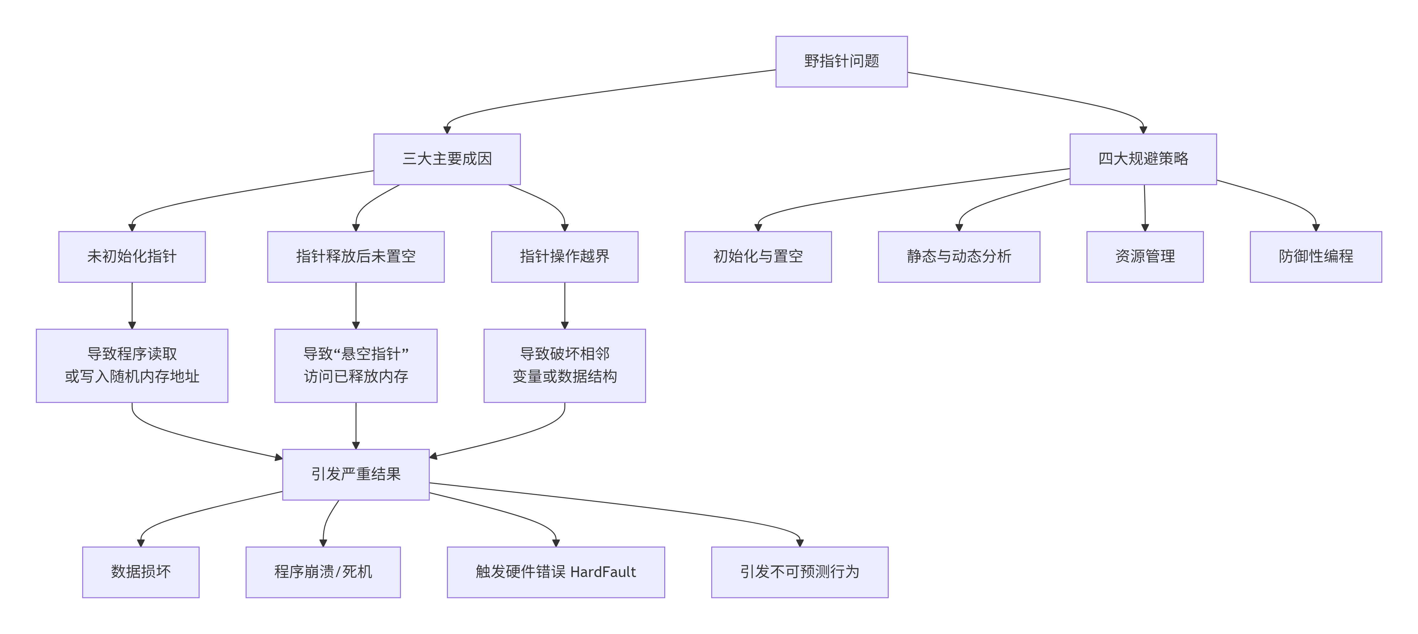 野指针 指的是指向无效内存地址的指针。在STM32这样的嵌入式系统中,野指针会导致程序行为异常、数据损坏、甚至硬件故障(如进入硬件错误中断HardFault),是需要严格避免的严重问题。