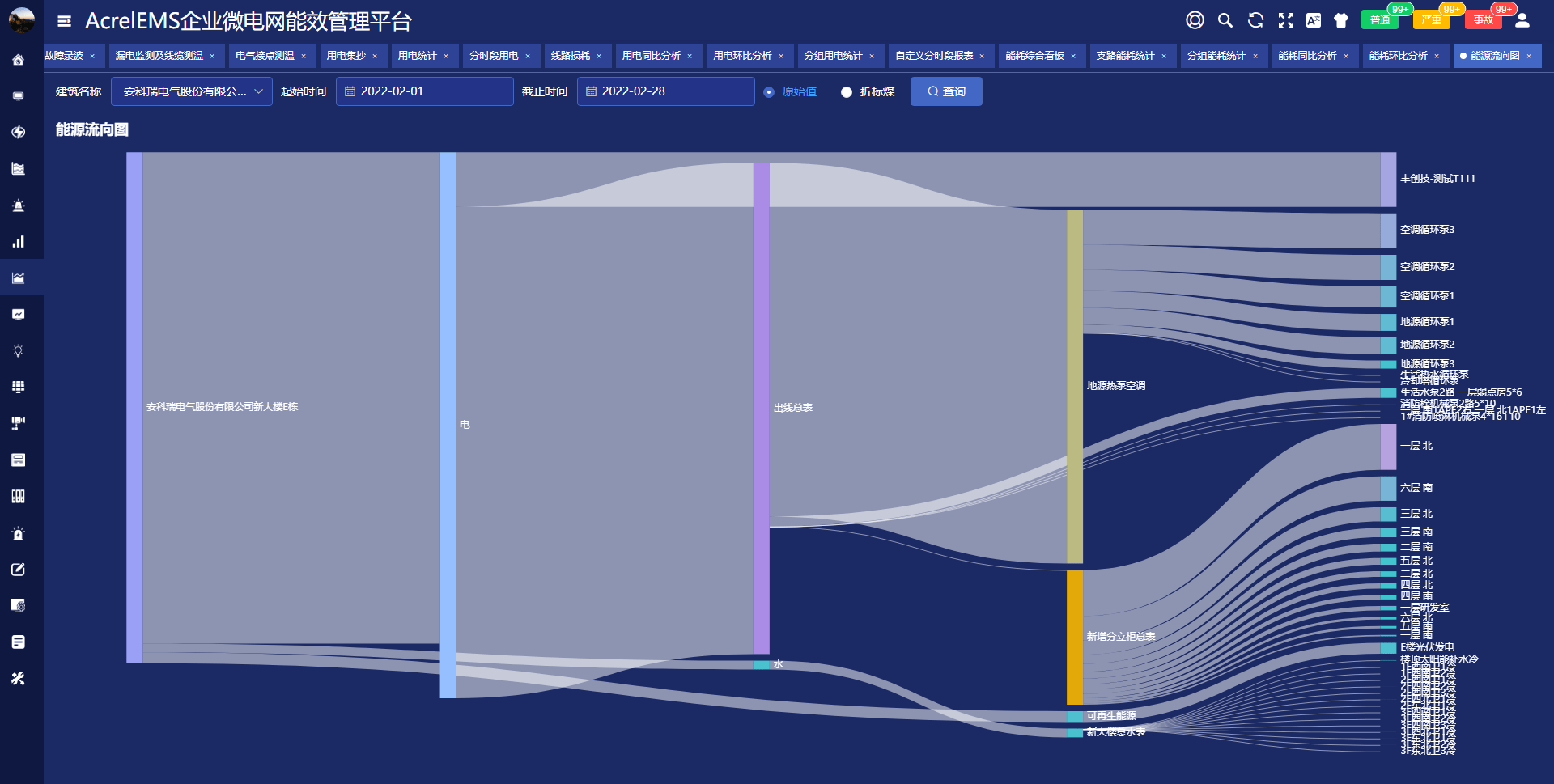 为工厂搭建计量体系,显示能源流向和能源损耗,通过能源流向图帮助企业分析能源消耗去向,找出能源消耗异常区域。