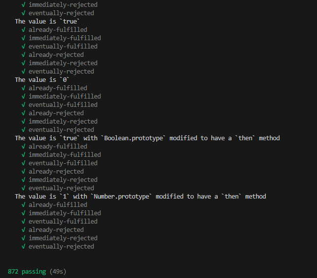 然后安装promises-aplus-tests包,比如用npm可以使用命令npm install -g promises-aplus-tests安装到全局,然后使用命令promises-aplus-tests 文件名即可进行测试,里面有872测试用例,全部通过即可以认为这是一个标准的promise。