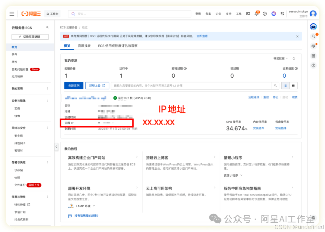 然后你就拥有了一台24小时在线的云端电脑。记下它的 公网IP地址 ,这是它的"坐标"。
