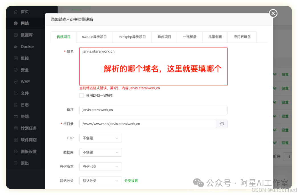 在域名这一栏中, 务必填写你刚购买并已解析的域名,千万不要误填成服务器的IP地址,否则你的域名会访问不到你的站上的内容。