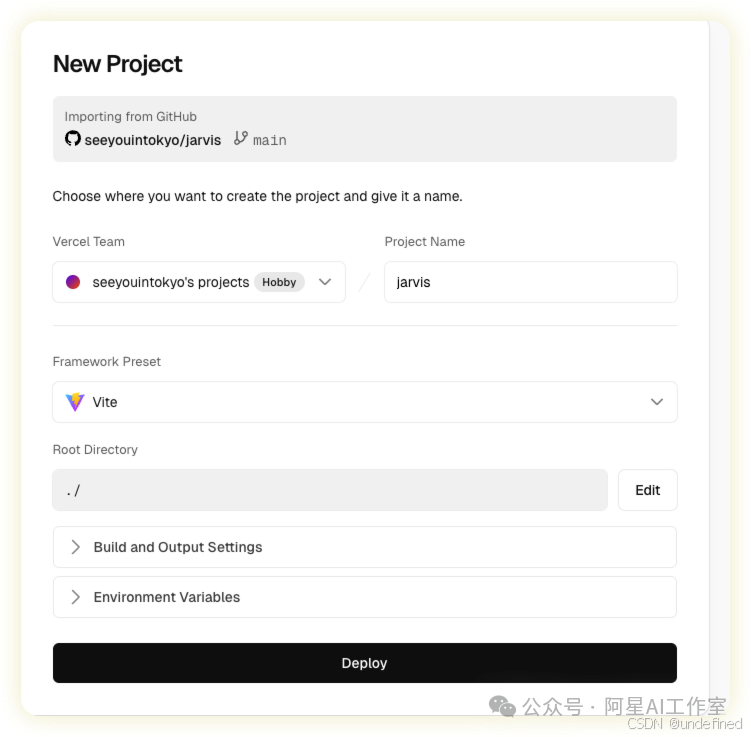 在配置页面,所有设置都保持默认即可,因为vercel本身是会自动识别的,freamework preset不知道的话可以根据源代码问下你的ai,让它来判断在vercel上怎么选择,然后直接点击底部的 "Deploy" 。