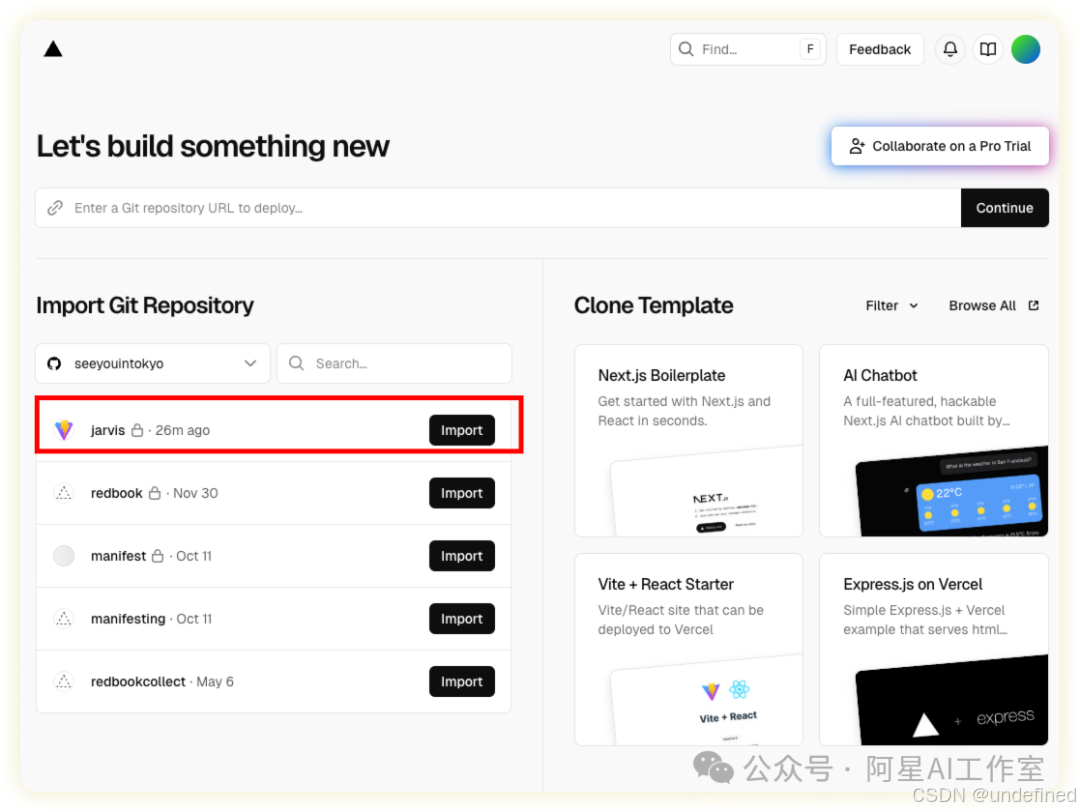 在列表里找到你刚创建的仓库,点击导入。