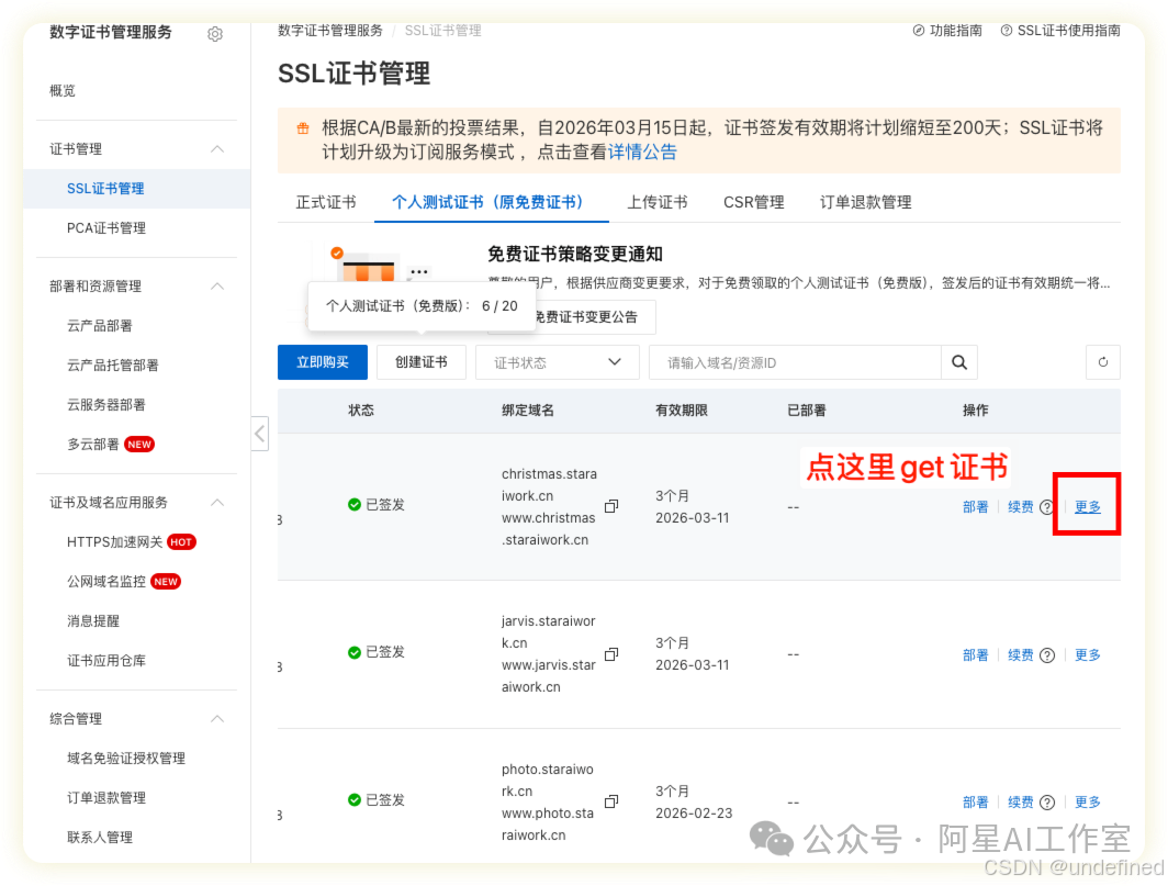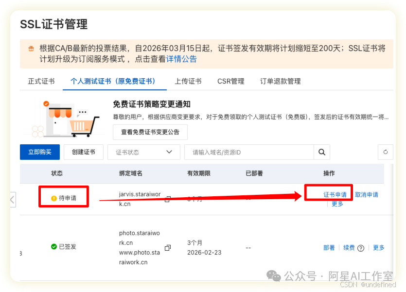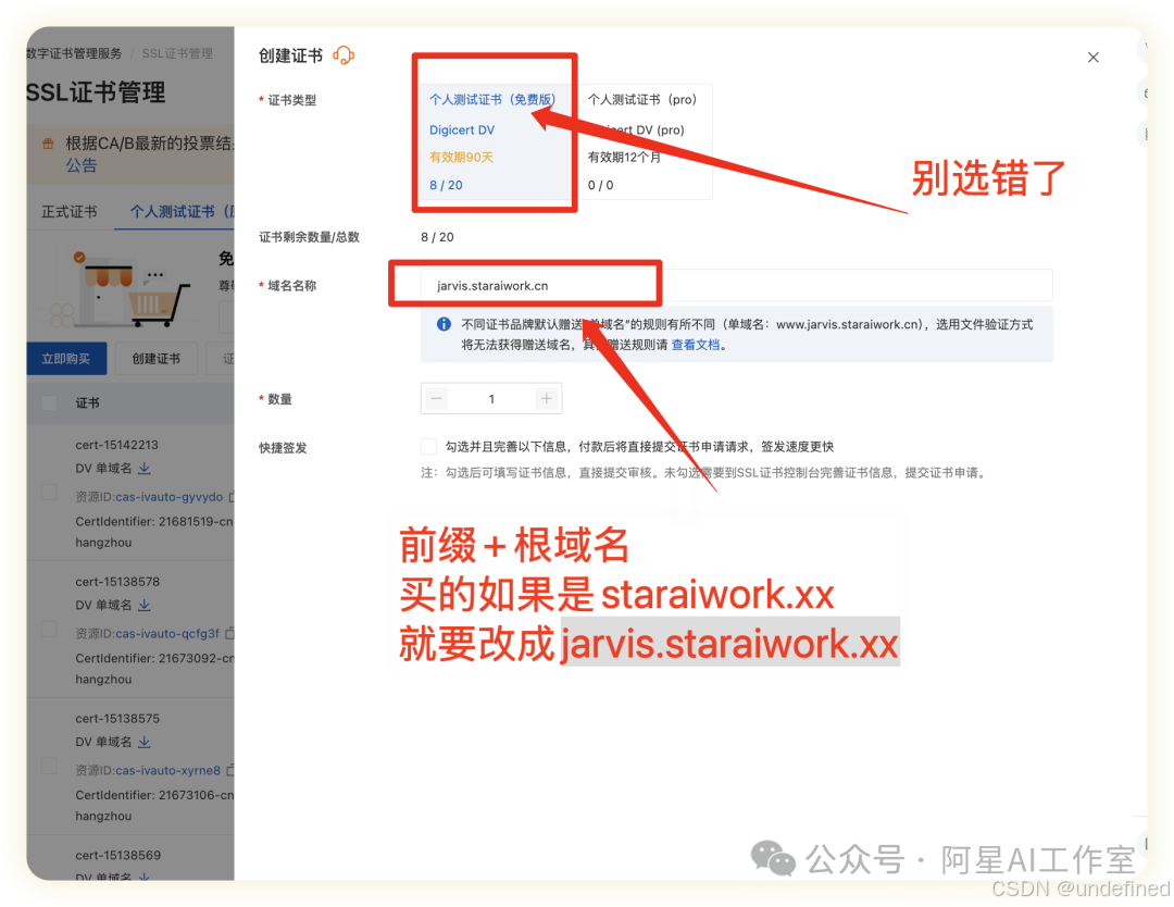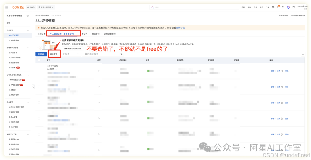 为了让你的网站地址是安全的 https://,需要SSL证书。在aliyunSSL证书页面,选择 "个人测试证书" 进行申请,然后记得是点创建证书!!!不是点旁边那个立即🛒 ,千万不要点错了!