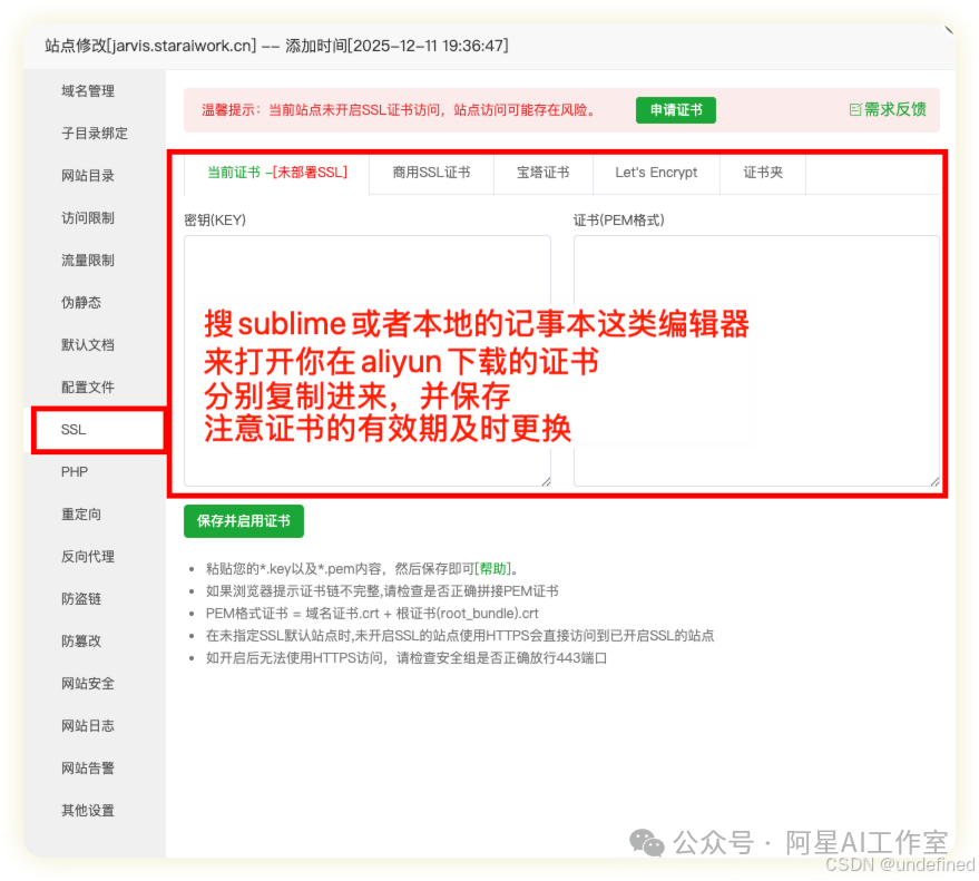 在SSL证书区域,将你下载的 .key 文件内容粘贴到"密钥(KEY)"框,.pem 文件内容粘贴到"证书(PEM)"框,然后保存。