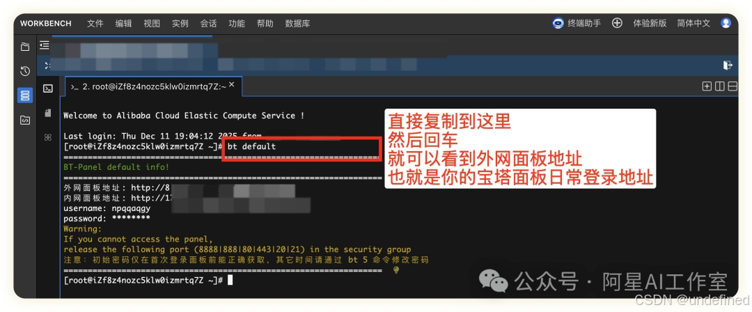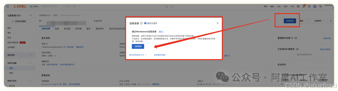我们选使用Workbench工具以SSH协议登录Linux实例。(不用理解,SSH)SSH是那套确保连接安全可靠的"底层协议和规则",而Workbench则是利用这套规则,为你打造的"一键直达、开箱即用"的豪华操作控制台。 你用Workbench,就是在享受SSH带来的安全,同时免去了使用SSH的繁琐。
