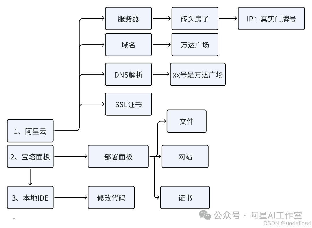 如果你想更深入了解一个网站是如何从零搭建起来的,享受完全掌控的感觉,可以使用国内常见的aliyun服务器和宝塔面板来操作。先看图理解一下各个名词的含义。