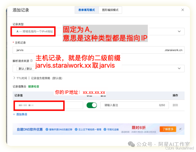 然后添加一条记录:类型选 A记录 ,主机记录填 @。