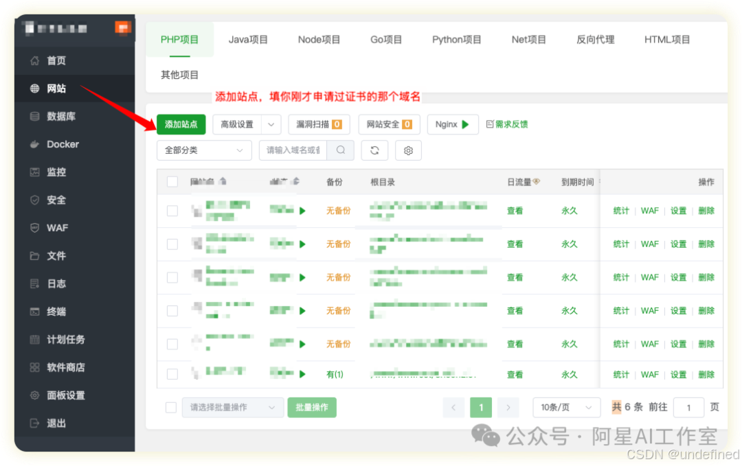 在宝塔面板左侧点击"网站",然后点击"添加站点"。