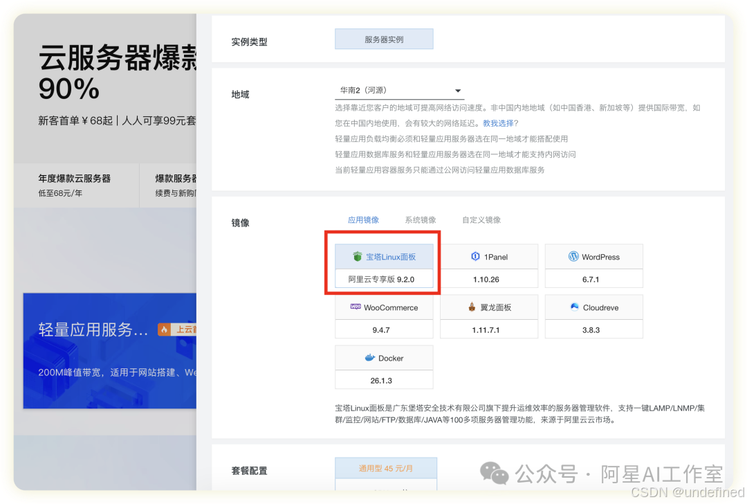 选择合适的配置(最低档即可),记得一定要选这个宝塔面板的!不要选别的!咱们后面讲的都是围绕这个版本的。