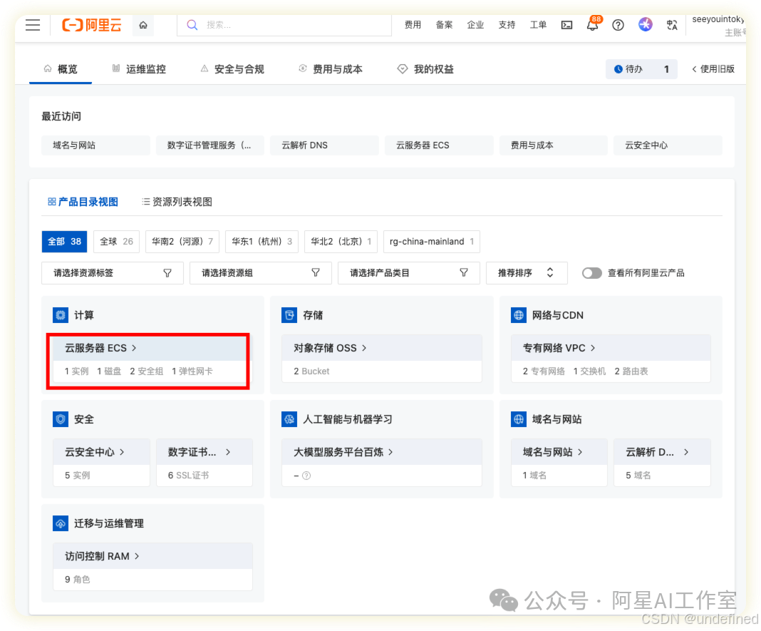 之后要找到这个服务器,就直接点右上角的控制台就可以了,aliyun常见的功能都在这里,然后选择ECS👇。