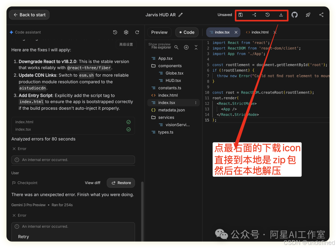 因为我们是要手动部署,所以先将 Google AI Studio 里的完整项目文件保存到你电脑上。