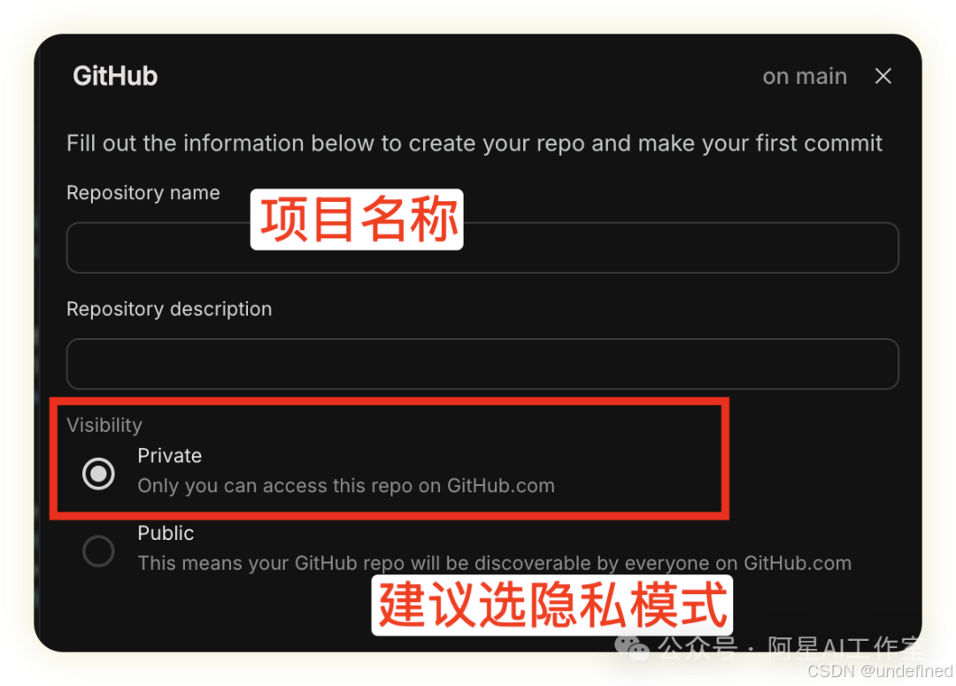 接着会让你选择是否公开代码,建议大家直接选private,之后如果有需要再公开。一旦public了地球上的程序员都能搜到看到-_-||