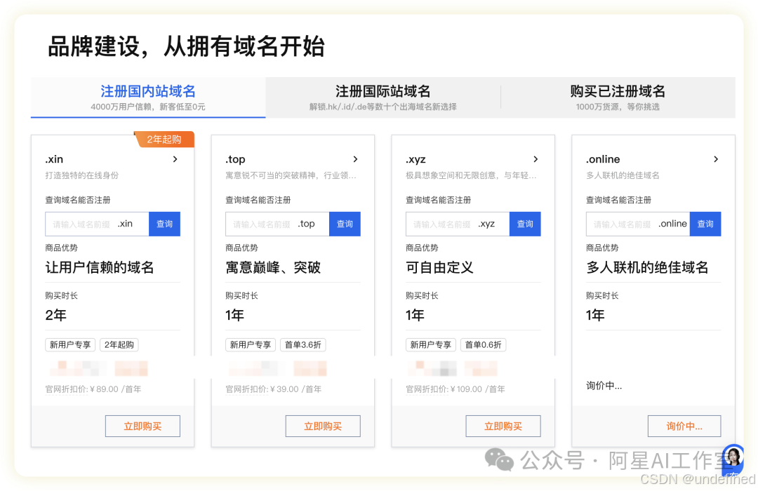 在aliyun或任何域名服务商那里,挑选一个你喜欢的、好记的域名,最好cn、com结尾的常见的,不要太奇怪的。