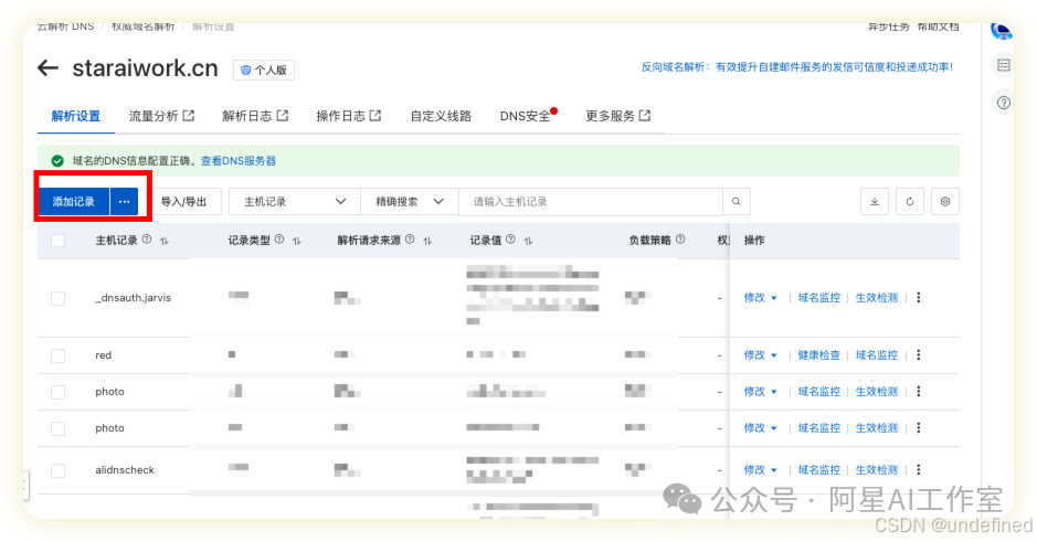 可以看到解析记录的类型是TXT,一会儿我们还要添加一条类型为A的,一般一共就这两条。