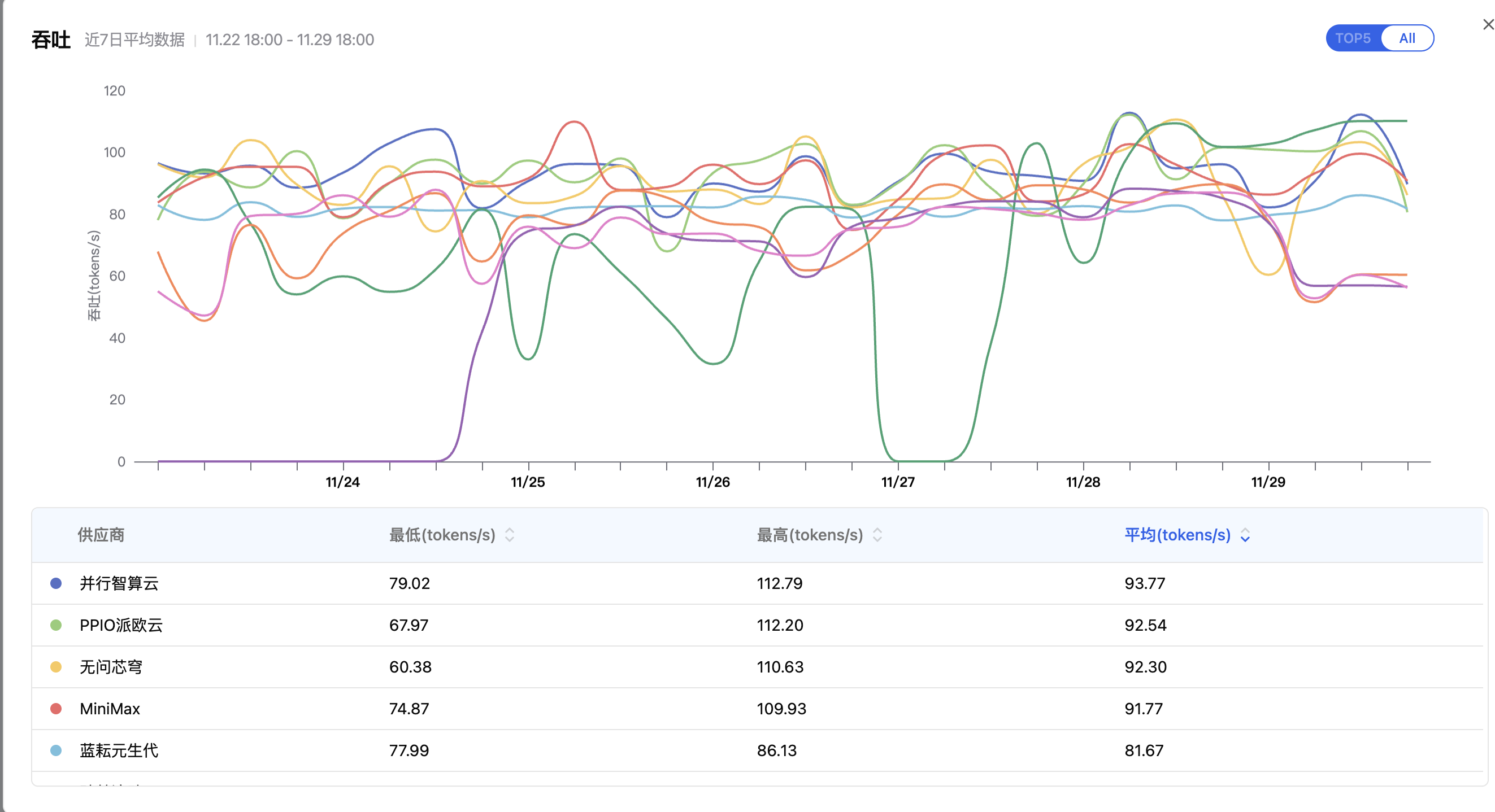 - 供应商的性能是动态的: 请看图中的吞吐曲线,即便是头部大厂,生成速度也在 60~110 tokens/s 之间剧烈波动。