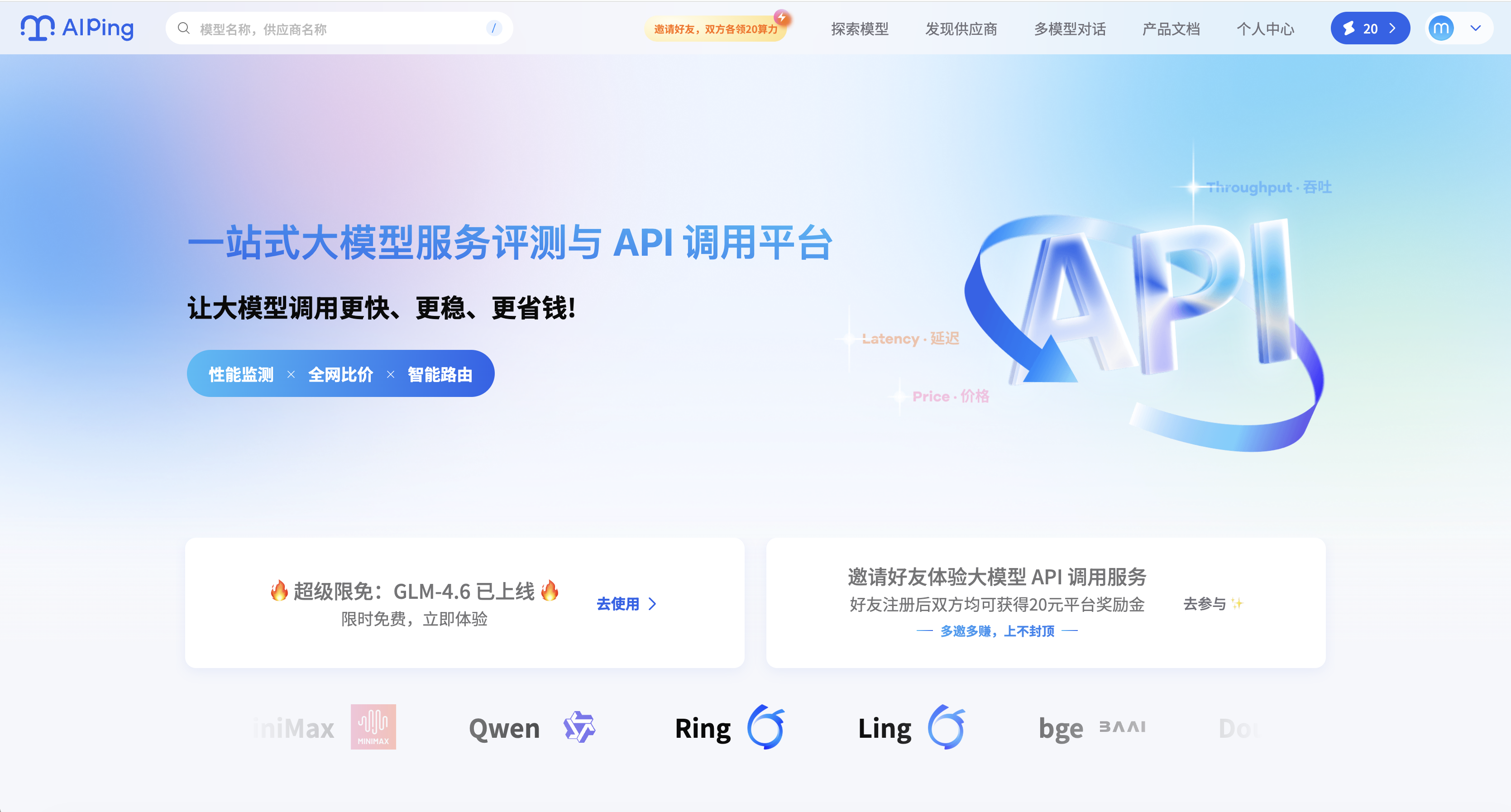 前两天在技术群里看到有人推荐 AI Ping(清程极智) ,号称是"一站式大模型服务评测与 API 调用平台"。我也去试玩了一下,发现它不光能做智能路由 帮我省钱,最重要的是------它现在配合 Vibe Coding 工具居然能免费薅羊毛!