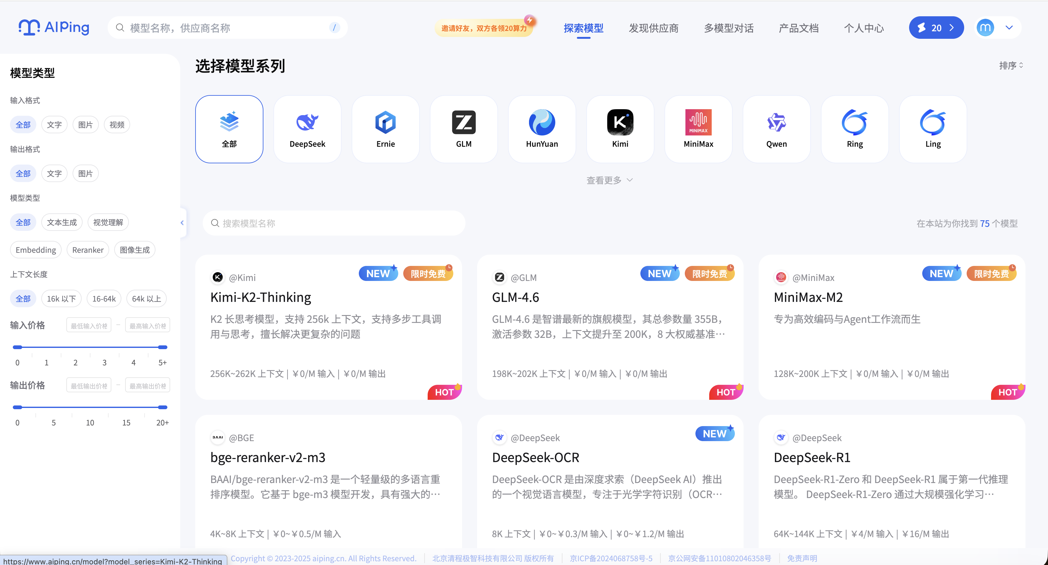 而 AI Ping 在后台直接打通了行业内 27+ 顶级供应商。这意味着,只需这一个账号,你就瞬间拥有了一个可以随时调配全网数百个大模型的**"算力指挥中心"**。无论是国外的闭源巨头,还是国内的开源新星,都在你的射程范围之内。