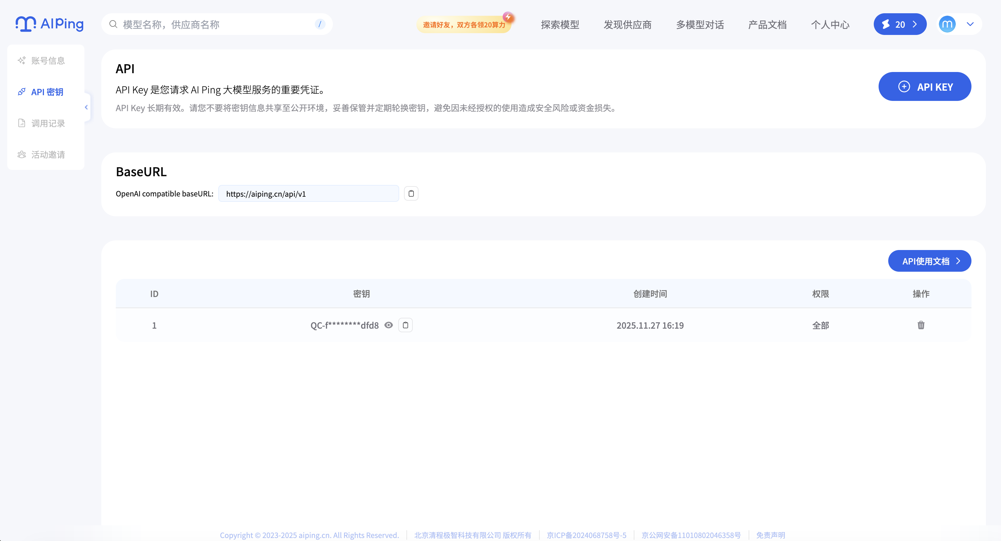 在这里,你将获得两样东西:统一的 API Key 和 Base URL。请务必保存好它们,这不仅仅是一串字符,而是你后续解锁 IDE 全模型能力的**"万能钥匙"**。