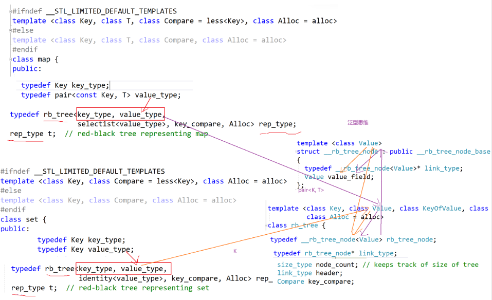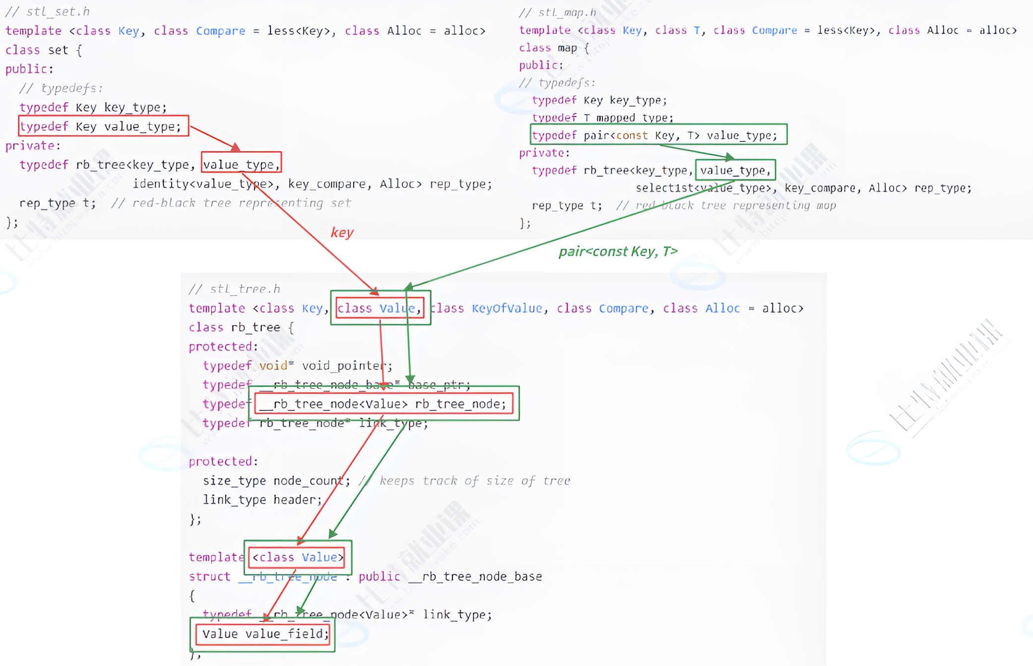 rb_tree第二个模板参数value已经控制了红黑树节点存储的数据类型,为什么还要穿第一个模板参数Key呢?尤其是set,两个模板参数是一样的,这是很多uu会有的有个疑问。要注意的是对于map和set,find / erase时候的模板参数都是Key,所以第一个模板参数是传给find / erase等函数来做形参的类型的。对于set而言,两个参数是一样的;但是对于map而言就不一样了,map容器Insert的是pair对象,但是find / erase的是Key对象。