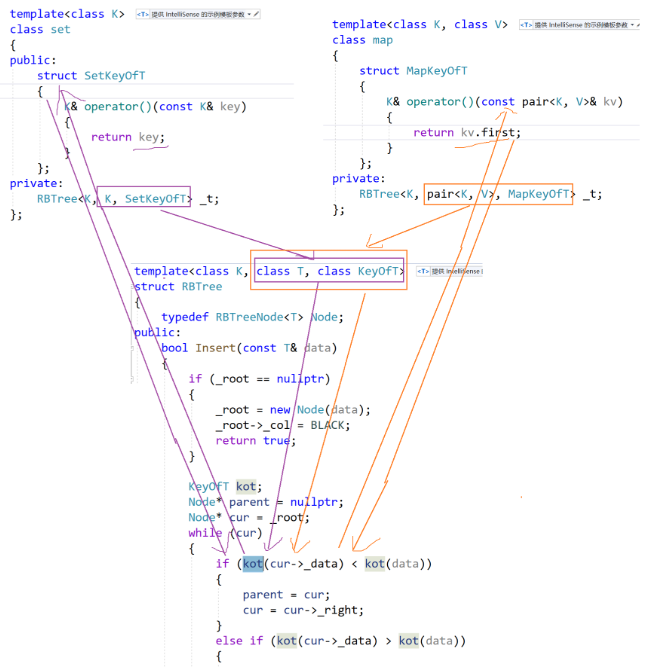 其次因为RBTree实现了泛型不知道T参数导致是K,还是pair<K,V>,那么insert内部进行插入逻辑比较时,就没办法进行比较,因为pair的默认支持的是key和value一起参与比较,我们需要时的任何时候只比较key,所以我们在map和set层分别实现一个MapKeyOfT和SetKeyOfT的仿函数传给