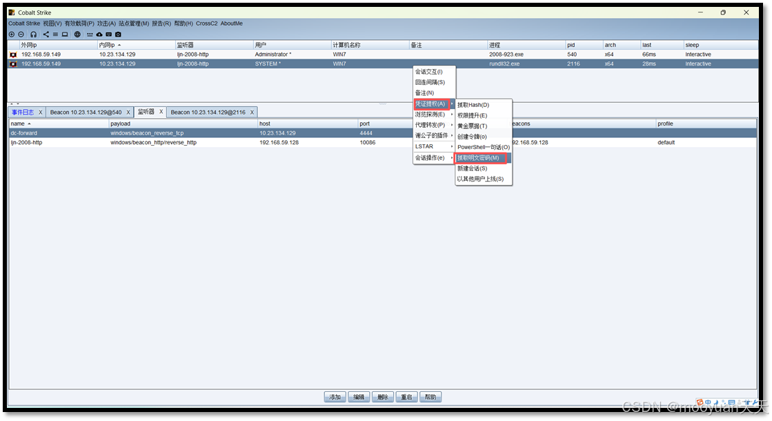 选中10.23.134.129的会话(system用户),右键选择"凭证提权-抓取明文密码",如下图所示。
