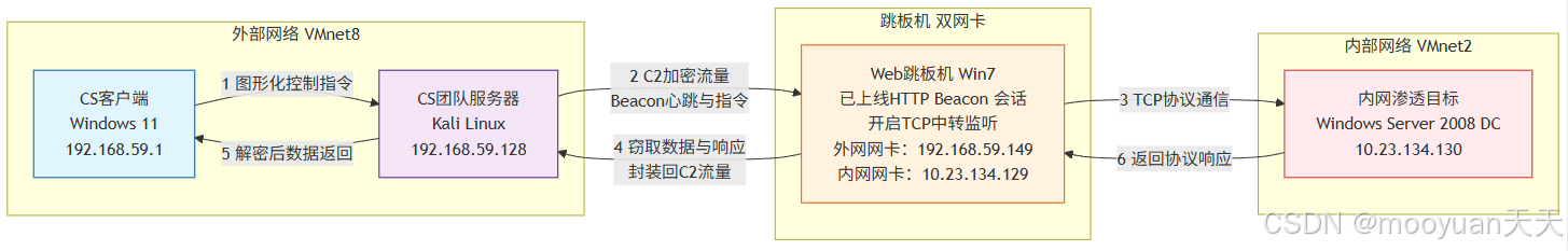 10.23.134.130]A --> |1 图形化控制指令| B B --> |2 C2加密流量<br>Beacon心跳与指令| C C --> |3 TCP协议通信<br>| D D --> |6 返回协议响应| C B --> |5 解密后数据返回| A C --> |4 窃取数据与响应<br>封装回C2流量| B subgraph 外部网络 [外部网络 VMnet8] A B end subgraph 跳板机 [跳板机 双网卡] C end subgraph 内部网络 [内部网络 VMnet2] D end style A fill:#e1f5fe style B fill:#f3e5f5 style C fill:#fff3e0 style D fill:#ffebee style A stroke:#01579b style B stroke:#4a148c style C stroke:#e65100 style D stroke:#c62828