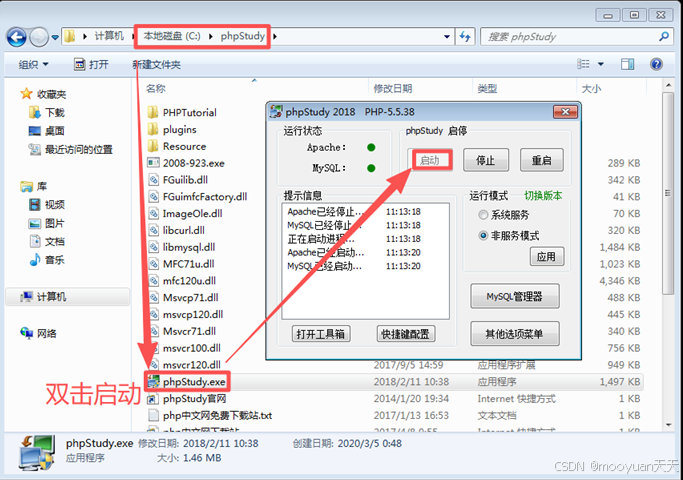 打开c盘phpstudy目录下启动小p,启动Apache和MySQL服务器,具体步骤如下所示。