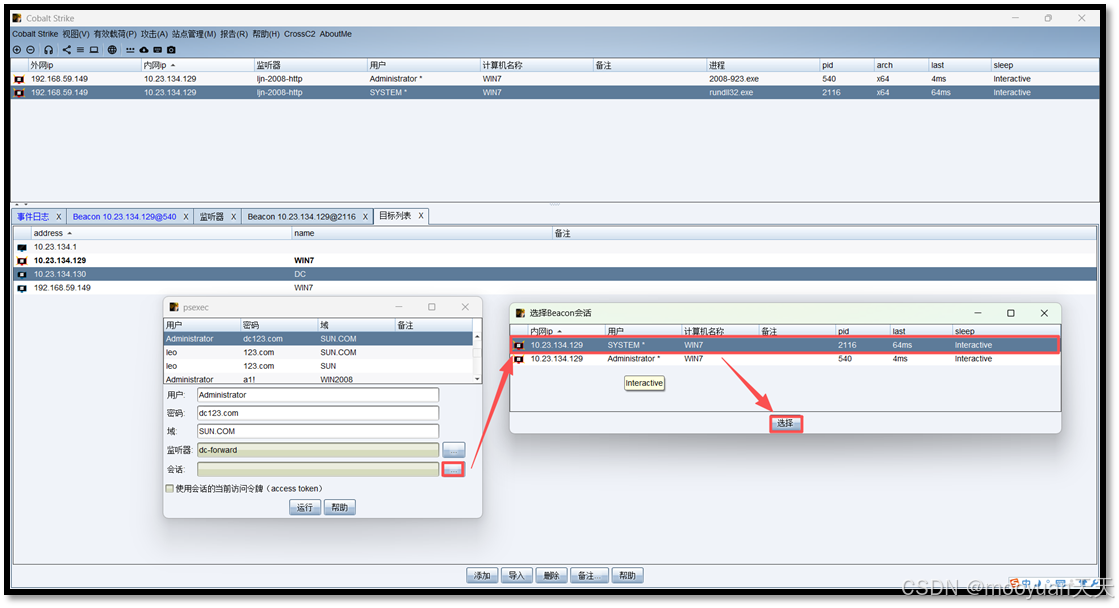 - 例2,利用一些横向移动技术,如通过 IPCS 连接对目标主机进行 Psexec 攻击,指定使用创建的中转监听器,从而使目标主机上线。