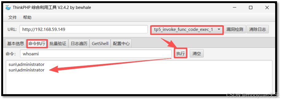 对于基本信息查出来的每个code exec漏洞,使用综合利用工具中的"命令执行"模块进行渗透,查看是否whoami可以正常执行,以tp5 invoke func code exec1为例,成功执行whoami,返回sun\administrator。