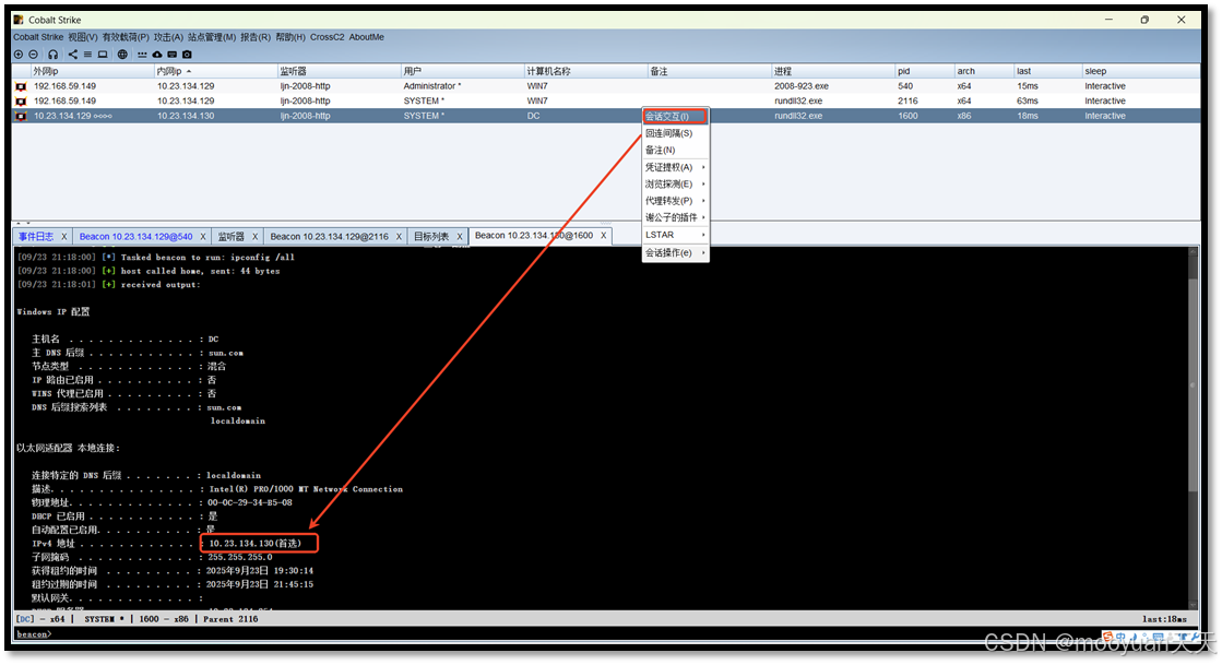 在新上线的DC域控会话上-右键-执行"会话交互",并输入shell ipconfig命令,如下所示显示的ip地址为10.23.134.130,说明渗透成功,具体如下所示。
